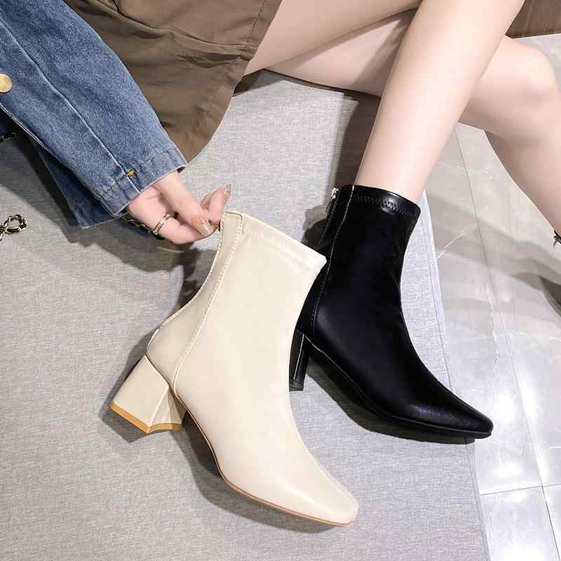 ブーツ レディース ショートブーツ スクエアトゥ 太ヒール チャンキーヒール 薄手 春秋 バックジップ ハイヒール 美脚