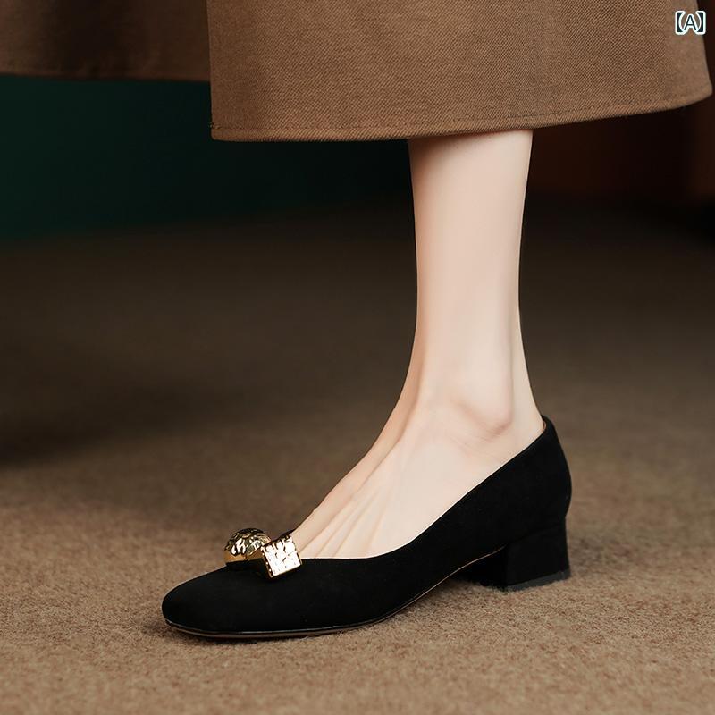 レディース 夏 パンプス 歩きやすい ヌバックレザー 厚手 ヒール シングル シューズ 女性 スタイル スクエアトゥ V 口 浅い口 ミディアム ビーニー ソフト メリージェーン レトロ おばあちゃん 靴