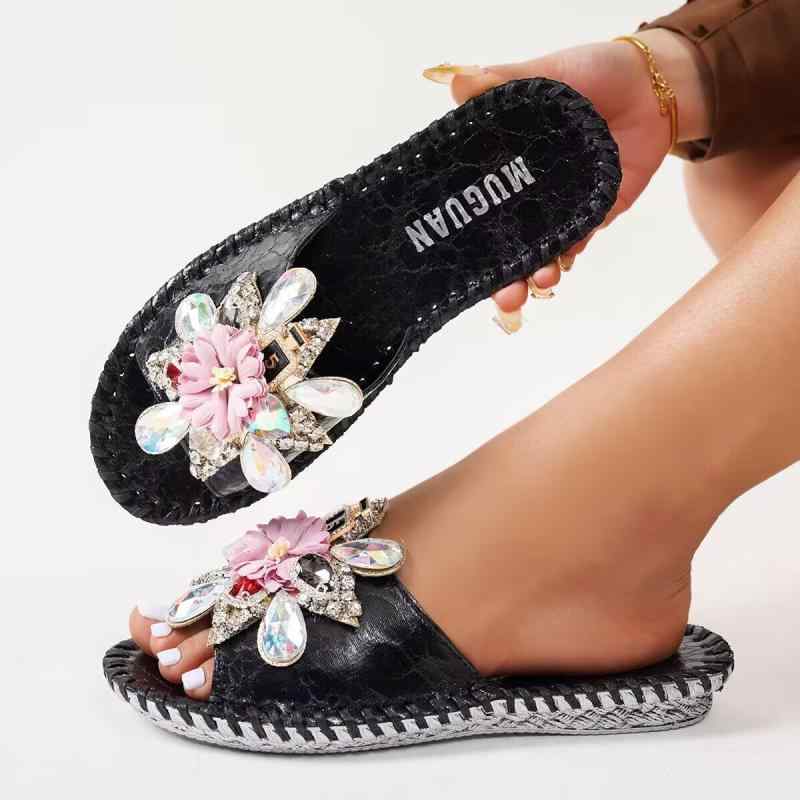 サンダル レディース 女性用 フレンチスタイル ラインストーン クリスタル フラワーモチーフ ワンストラップ スライド ぺたんこ 韓国風 上品 エレガント ミュール 普段使い 軽量 通気性 スウィート ガーリー 春夏