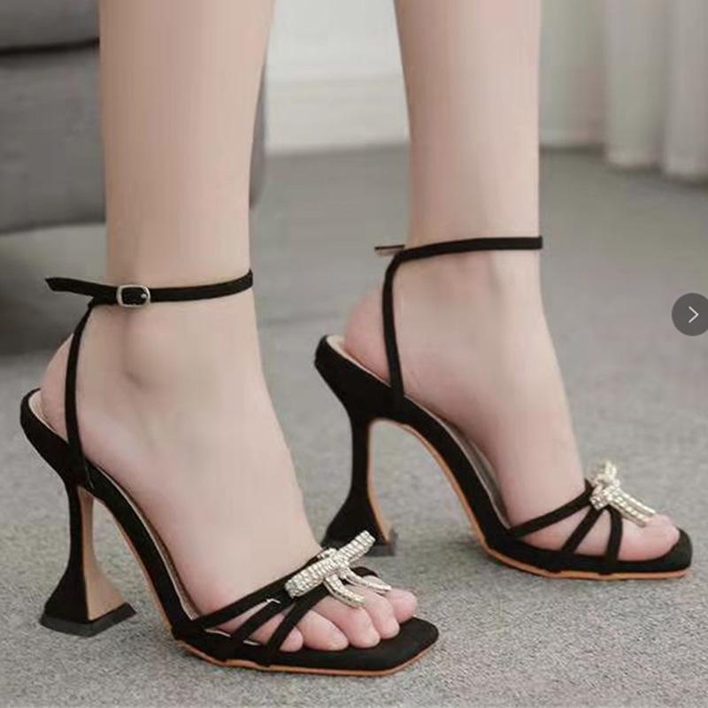 サンダル レディース ハイヒール ピンヒール ラインストーン リボン スクエアトゥ ローマサンダル 合成皮革 ストラップ スタイルアップ 通気性 軽量 ブラック ベージュ パーティー お呼ばれ 結婚式 二次会 春夏