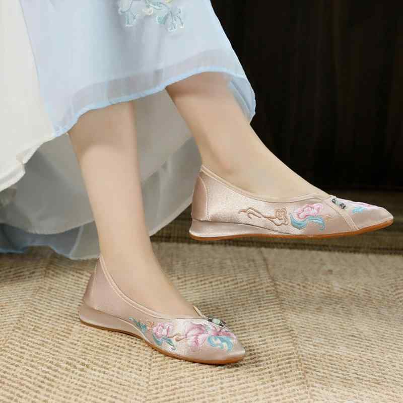 パンプス レディース レトロ サテン 刺繍 滑り止め ラバーソール 花柄 ポインテッドトゥ ウェッジヒール ローヒール スリッポン チャイナドレス 民族風 春秋冬