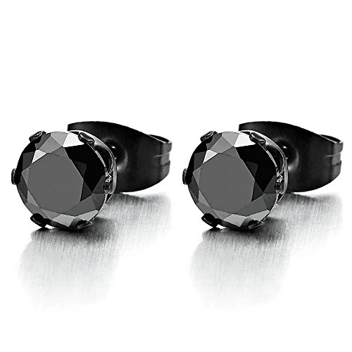 【中古】【未使用・未開封品】(Stone Size: 6MM) - 3-8MM Black Cubic Zirconia Mens Ladies Black Stud Earrings Stainless Steel, 1 Pair