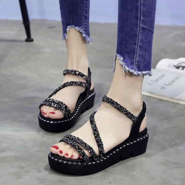サンダル レディース 厚底 水钻 坡跟 ローマ 学生 フラット ストラップ ぺたんこ かわいい おしゃれ 普段使い 歩きやすい 黒 シルバー