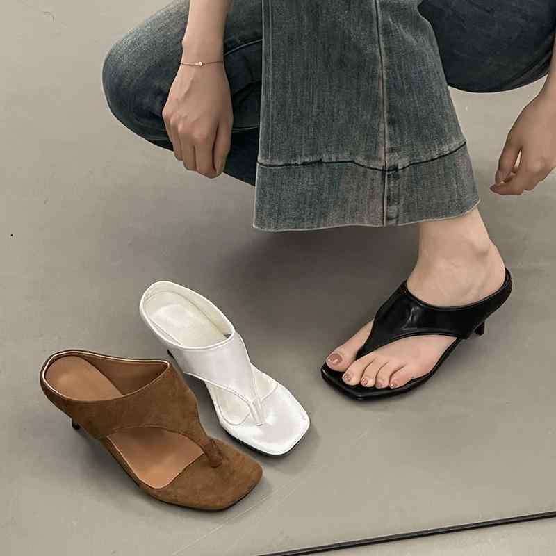 サンダル レディース フレンチレトロ 華奢見え スクエアトゥ トングサンダル ピンヒール 超繊維 PU裏地 黒 白 茶色 韓国版 かわいい シンプル 普段使い