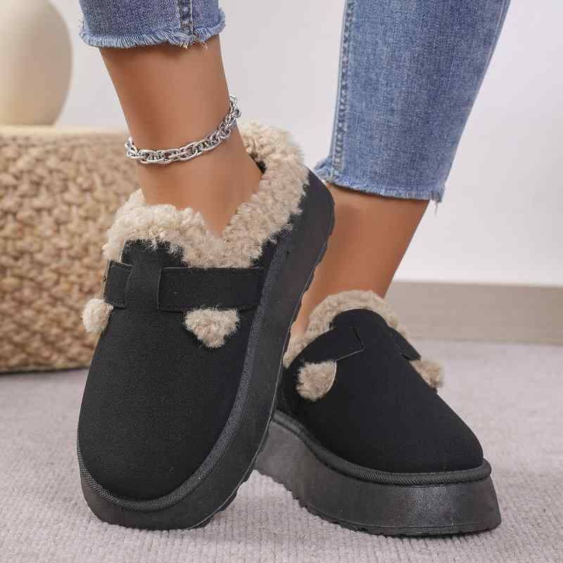 スリッパ レディース 秋冬 厚底 ボア ストラップ飾り 保温 カジュアル 人工皮革 フェイクファー ラウンドトゥ ゴム底 無地 黒 茶色 ベージュ系 大きいサイズ 女性用 普段使い 室内履き