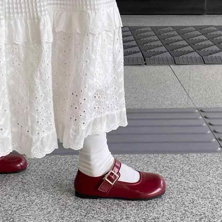 マリージェーン レディース フラットシューズ ストラップ ラウンドトゥ ローヒール PUレザー 合成皮革 ぺたんこ靴 赤 春夏 秋冬