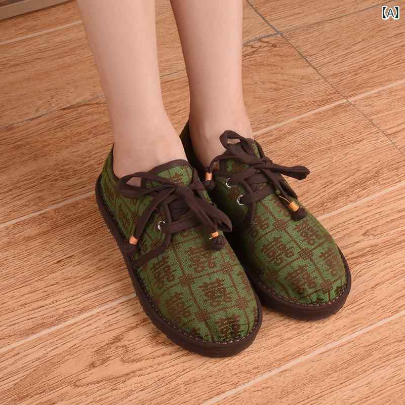 靴 レディース シューズ 布靴 千層底 ローカット スニーカー 紐靴 伝統工芸 民族風 オリーブグリーン ぺたんこ 歩きやすい 婦人靴 カジュアル 通気性 疲れにくい キャンバス ゴム底