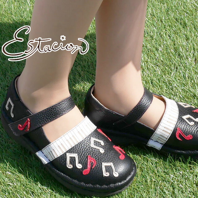 エスタシオン 送料無料 最強翌日配送 レディース ストラップシューズ コンフォートシューズ 革靴 パンプス メリージェーン ローヒール 歩きやすい 疲れない 黒 ブラック ベルクロ 本革 レザー カジュアル 音符柄 ピアノ柄 ヒール高さ約4cm Estacion MSE148