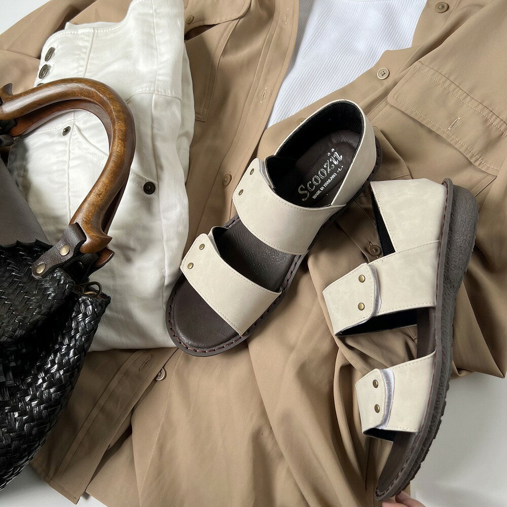 商品情報原産国タイ素材甲:PUレザー 底:軽量TPR高さかかと部分3cmワイズ(幅)3E相当2Wayフラットサンダル|柔らか素材 3E幅広|マジックテープで足にフィット|疲れにくい|旅行|通勤・通学|カジュアル|Moda Ladian 2609 マジックテープで足幅調整できるカジュアルフラットサンダル 甲部分はマジックテープになっているので自分の足の幅に調整できてフィットする♪かかと付きでしっかり足を守ってくれるから見せたくない方や遠出でも安心。痛くなりにくい柔らか素材です。カシメがポイントのこの夏大活躍間違いなしのサンダルです。【店長レビュー・普段24.0cm(ものにより24.5cm)エジプト型】こちらのサンダルはLサイズで丁度です。幅広の方はワンサイズ大き目でも良さそうです。また、つま先をあまり出したくない方はワンサイズ大きめで甲の前の部分をキツめに締めていただくと丁度良いかと思います。黒はツヤ多め、カーキ、グレーツヤあり、アイボリーはツヤ無しでヌバック調になっています。どのカラーもジーンズやスカートに合いそうです。かかとがあるので足が冷えず安心です。踏んで歩くこともできるので楽ちん♪【サイズ】Sサイズ(22.5~23.0cm)・Mサイズ(23.0~23.5cm)・Lサイズ(23.5~24.0cm)・LLサイズ(24.0~24.5cm)【カラー】ブラック・カーキ・グレー・アイボリー・ダークブラウン【原産国】タイ【素材】甲:合成皮革 底:TPR【高さ】約3cm 5