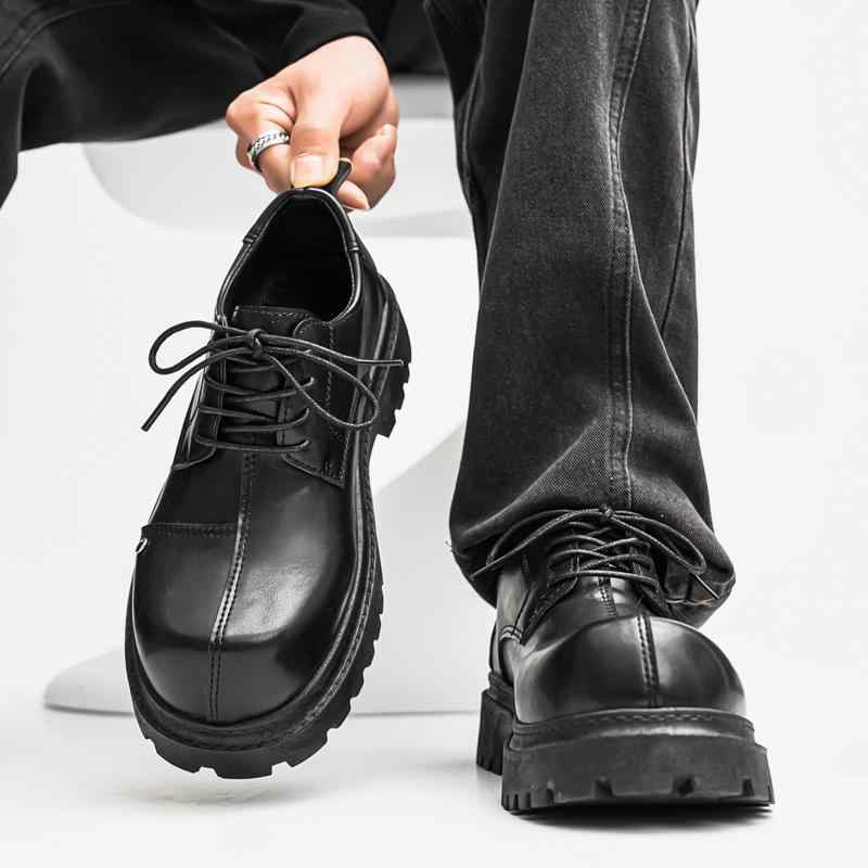 ビジネスシューズ 黒 ローファー メンズ 韓国系 スタッズ 個性的 厚底 レースアップ ワークシューズ レザー 靴 男性用 ブラック 切り替え ぽってり ゴツめ アクセント カジュアル 通勤 仕事 パパ 通学 学生 おしゃれ 正装 パーティー 革靴