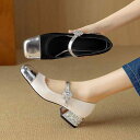 メリージェーンシューズ レディース 牛革 羊革 スクエアトゥ ワンストラップ バックル ラインストーン チャンキーヒール ミドルヒール 切り替え フェミニン 普段使い オフィス カジュアル