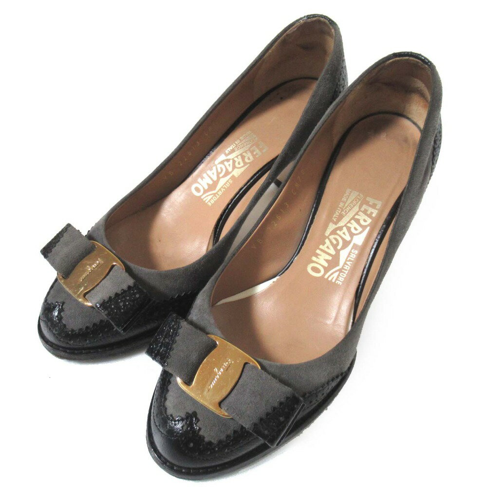 【中古】美品 Salvatore Ferragamo サルヴァトーレフェラガモ TANIA ヴァラリボン スエード レザー パンプス 5C 22.5cm相当 グレー×ブラック レディース Luxs ブランド古着のリュクス
