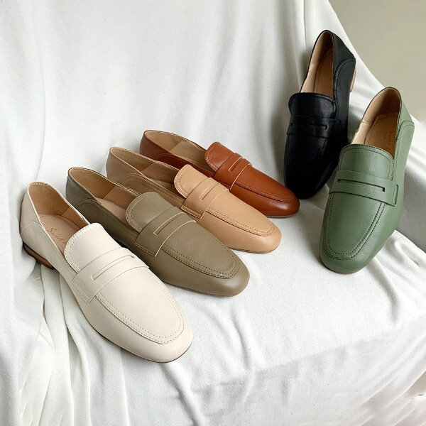 ローファー スクエアトゥ 羊革 フラット レディース ぺたんこ 黒 茶 ブラック ブラウン オリーブ ベージュ トープ アイボリー おじ靴 革靴 靴 婦人靴 韓国