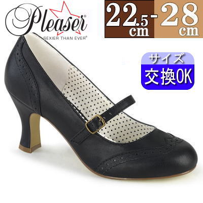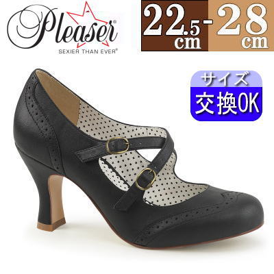 Pleaser プリーザー ローヒール パンプス 7.5cm ヒール 低め 黒 ブラック 合皮 フェイクレザー 大きいサイズ 小さいサイズ レディース メンズ キトンヒール ラウンドトゥ 甲ストラップ 衣装 仮装 靴 シューズ 23cm 24cm 25cm 26cm 27cm 28cm FLAPPER-32 FLAP32/BPU 取寄
