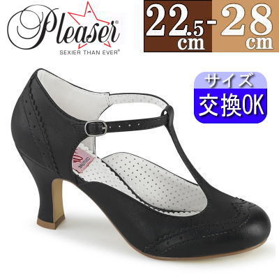 PLEASER【取り寄せ】プリーザー・キトンヒールTストラップパンプス/品番:FLAPPER-26/FLAP26/7cmヒール/キトンヒール/デザインパンプス/ローヒールパンプス/大きいサイズ/女装/キュート/ピンナップシューズ/フェイクレザーブラック/黒色