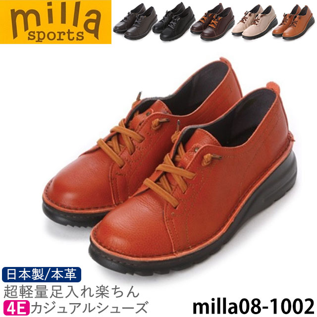 【割引クーポン対象商品】送料無料 レディース カジュアル シューズ ミラスポーツ Milla sports 日本製 本革 4E 超軽量 足入れ 楽ちん コンフォート ASWソール ブラック ダークブラウン Dブルー ブリック バニラ キャメル 5cm ヒール コンビニ受取対応商品
