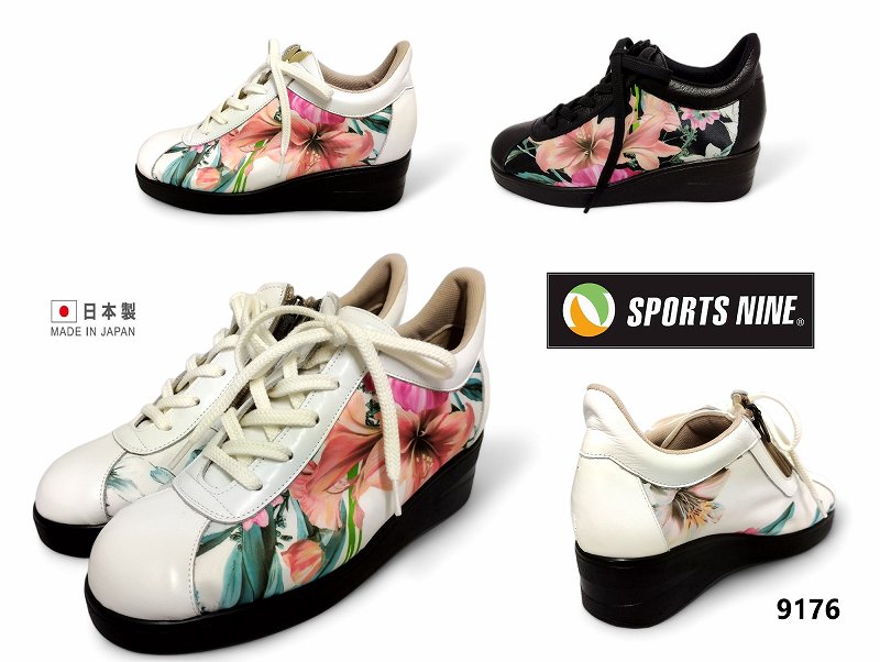 【スーパーSALE10%OFF対象】SPORTS NINE スポーツナイン 9176 3E レディース コンフォートカジュアル 花柄 きれい 美脚効果 ウェッジ底 天然皮革 低反発 軽量 厚底 疲れにくい 誕生日