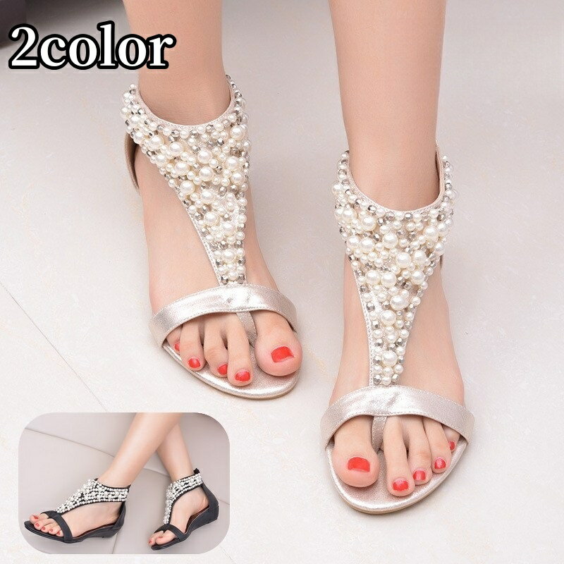 送料無料 ストラップサンダル ローヒール レディース 女性 靴 フェイクパール ビジュー バッグファスナー トングサンダル シューズ キラキラ 滑り止め付き チャンキーヒール おしゃれ かわいい 上品 きれいめ シンプル お出かけ パーティ フォーマル 夏 黒 金色