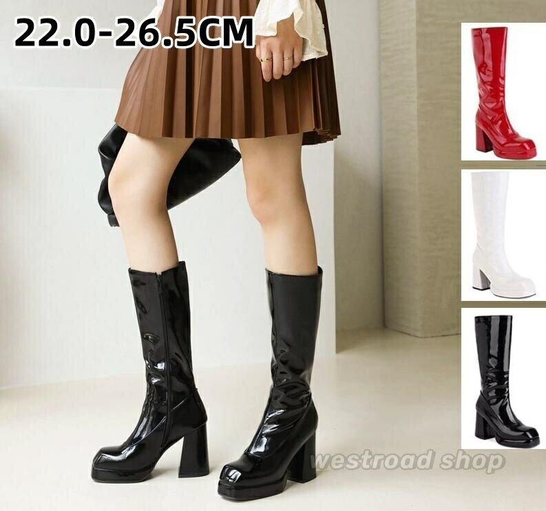 レディースブーツ エナメル ブーツ 無地 厚底ロングブーツ サイドジップ 9.5センチ 膝丈ブーツハイヒール 光沢 ロング丈 秋冬 春秋 小さいサイズ 大きいサイズ 22.0-26.5CM 太ヒール チャンキーヒール 疲れにくい 美脚 通勤 二次会 結婚式 パーティー お呼ばれ ダンス 舞台