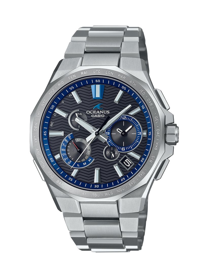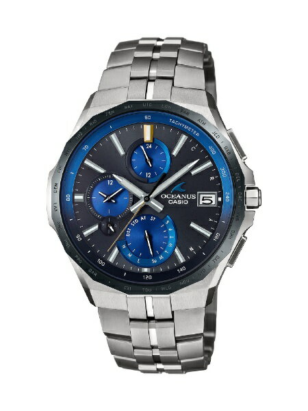 ケース・ベゼル材質: チタン メタルバンド(チタン) 無垢バンド スライドアジャスト機構付きワンプッシュ三つ折れ式中留 無反射コーティングサファイアガラス ネオブライト チタンカーバイト処理 10気圧防水 タフソーラー(ソーラー充電システム) 電波受信機能:自動受信(最大6回/日) (中国電波は最大5回/日)/手動受信、 <日本>受信電波:JJY、周波数:40kHz/60kHz(福島/九州両局対応モデル) <北米地域>受信電波:WWVB、周波数:60kHz <ヨーロッパ地域>受信電波:MSF/DCF77、周波数:60kHz /77.5kHz <中国>受信電波:BPC、周波数:68.5kHz *ホームタイム設定を受信可能な都市に設定すると、都市に合わせた局を受信します。尚、時差は選択した都市によって設定されます。 針位置自動補正機能 ワールドタイム:世界29都市(29タイムゾーン、サマータイム自動設定機能付き)+UTC(協定世界時)の時刻表示 バッテリー充電警告機能 パワーセービング機能(暗所では一定時間が経過すると運針を停止して節電します) 日付表示 フルオートカレンダー フル充電時からソーラー発電無しの状態での駆動時間 機能使用の場合:約7ヵ月 パワーセービング状態の場合:約29ヵ月 ホームタイム都市(受信機能対応都市)/ 受信電波 東京/日本の標準電波JJY40・JJY60 (ホノルル)、(アンカレジ)、ロサンゼルス、デンバー、シカゴ、ニューヨーク/アメリカの標準電波WWVB ロンドン、パリ、アテネ/イギリスの標準電波MSF・ドイツの標準電波DCF77 香港/中国の標準電波BPC ※( )内の各都市は条件が良ければ受信する場合もあります。 ※ 電波受信が行われない場合は、通常のクオーツ精度(平均月差±15秒)で動作します。 サイズ(H×W×D)/質量:45.8×41.3×10mm/88g 保証 メーカー3年保証“Elegance, Technology”をブランドコンセプトに、上質と多機能を追求している「OCEANUS(オシアナス)」のクラシックラインから、新型の3針デイトアナログモデルが登場。 スポーティなデザインとスマートアクセスによる簡単操作を特徴としています。デザイン的な特徴はガラス径を大きくしたワイドフェイスとスマートアクセス搭載ながらも10.0mmの厚みを実現した薄型ケースです。サファイアガラスの裏の外周にブルーの蒸着を施し、ブランドカラーであるブルーが鮮やかに輝きます。ゆがみの少ない上質な仕上げのザラツ研磨や、美しく装着感の良い桟残し構造のバンドを採用するなど、細部にまで上質さにこだわっています。シンプルな3針アナログモデルながら、ワールドタイムを直感的に操作できるスマートアクセスや電波受信、タフソーラー、針位置自動補正、ハイブリッドマウント構造を持つタフムーブメントを搭載しています。シンプルながらもハイスペックを搭載したNew3針デイトオシアナスの登場です。 ・ 感覚的な操作が可能な電子式リューズスイッチと、マルチモータードライブを組み合わせ、多彩な機能をスムーズに使える「スマートアクセス」 ・ 世界6局(日本2局、中国、アメリカ、イギリス、ドイツ)の標準電波を受信し、時刻を自動修正するマルチバンド6 ・ 針位置自動補正機能 ・ ムーブメントの耐久性を向上させるハイブリッドマウント構造 ・ ホームタイムの都市設定をするだけで(電波を受信しない都市も含む)サマータイムが自動で切り替わる、サマータイム自動設定機能 ・ タフソーラー ・ 10気圧防水機能