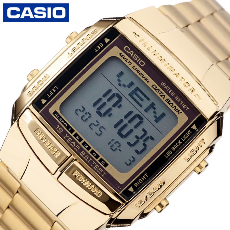 商品説明 【 CASIO DATA BANK データバンク 】 ファッションに敏感な若者を中心に人気のデータバンク。 多くのアーティストや芸能人が着用し、ファッションアイテムとして大人気です。 テレメモ30件や、LEDバックライト、13ヵ国語対応など、機能も充実したファッション性の高いモデルです。 フリー中留タイプのステンレスベルトなのでベルト調整が簡単。 小さなドライバーがあれば、ご自身でベルト調整ができるのでプレゼントにも最適です。 商品仕様 ムーブメント クォーツ 素材 ケース : 樹脂ベルト : ステンレス風防 : 樹脂ガラス カラー 文字盤 : ゴールド(液晶シルバー)ベルト : ゴールド サイズ (約)H 43.2×W 35.6×D 10.5mm 重さ (約) 60g 腕回り 最大 : (約) 20cm最小 : (約) 13cm 機能 ● 「テレメモ」機能:電話番号を最大30件メモリー(名前:8文字、番号部:15桁) ● 13ヵ国語対応(英語、ポルトガル語、スペイン語、フランス語、オランダ語、デンマーク語、ドイツ語、イタリア語、スウェーデン語、ポーランド語、ルーマニア語、トルコ語、ロシア語) ● デュアルタイム ● ストップウオッチ(1/100秒、24時間計、スプリット付き) ● タイマー(セット単位:1分、最大セット:24時間、1秒単位で計測) ● サマータイム設定機能 ● マルチアラーム5本(1本のみスヌーズ切替機能付き)・時報 ● フルオートカレンダー ● 12/24時間制表示切替 ● LEDバックライト(残照機能付き) ● 精度:平均月差±30秒 防水性能 日常生活防水 付属品 取説(日本語コピー)、保証書 保証期間 1年間 ITEM DETAIL