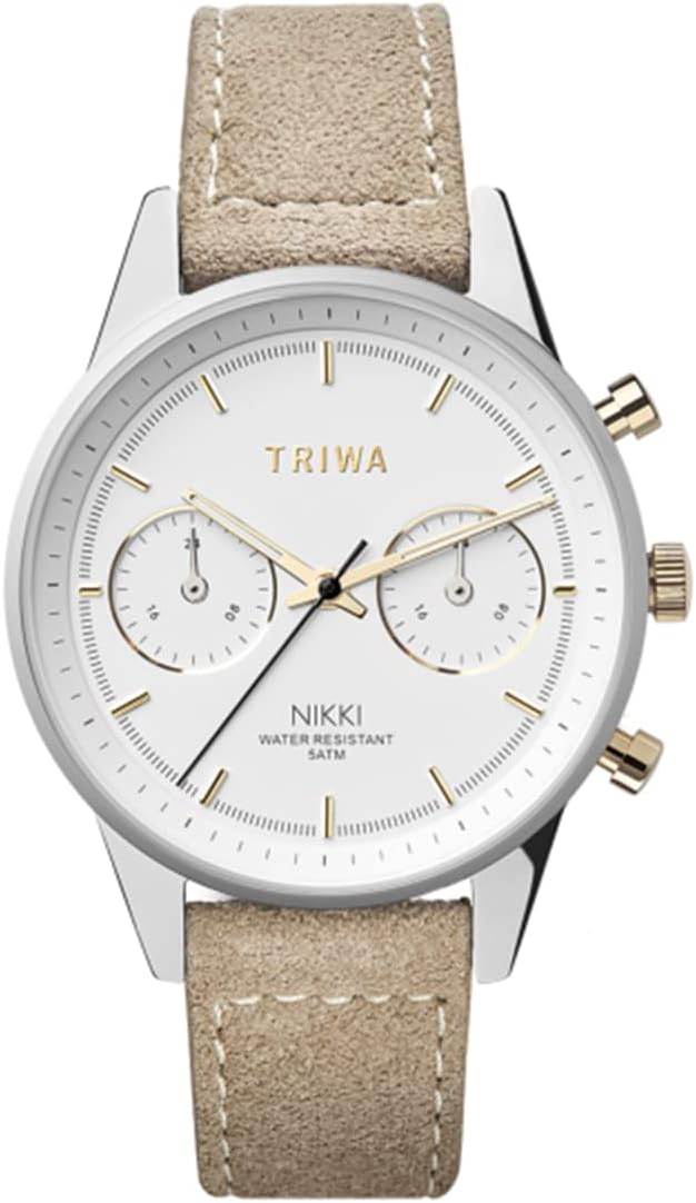 トリワ 腕時計 メンズ レディース GLEAM NIKKI ホワイト ベージュ NKST101-SW212612P TRIWA グリムニッキ アナログ クォーツ 日常生活防水 デュアルタイム レザーストラップ ステンレススチール ミネラルガラス ----《 TRIWA 》----------------------------------------------------TRIWAは2007年、スウェーデン・ストックホルムで、双子の兄弟 Herald, Didrikと 友人のTobiasとLudvigの4人組がスタートさせた時計アクセサリーブランドです。 古い慣習の残る時計業界に変革を起こすという意の ”Transforming the Industry of Watches”の頭文字を取って、TRIWAと名付けられ ました。 シンプルな中に完成度の高い格調あるデザインと高級感を持った気取らないスタイル はさすがデザイン王国北欧を強く感じさせます。----《 商品特長 》--------------------------------------------------清潔感のあるホワイト文字盤に、針・インデックス・リューズに施したゴールドが、派手さを抑えたさりげないアクセントとして映えます。肌馴染みの良いベージュのヴィーガンレザーが、ナチュラルに腕元に寄り添います。自分へのご褒美はもちろん、大切な方へのプレゼントにもおすすめです。----《 商品情報 》--------------------------------------------------型番:NKST101-SW212612P、サイズ:縦36mm×横36mm×厚さ8mm/ベルト幅16mm、モニター発色により色合いが異なる場合がございます。本商品は並行輸入品のため、説明書等は英語表記のものが付属しております。本商品は大変好評のため、売れ違いになる可能性がございます。あらかじめご了承ください。※商品の入荷時期によっては掲載しています写真と仕様が異なる可能性がございます。 5