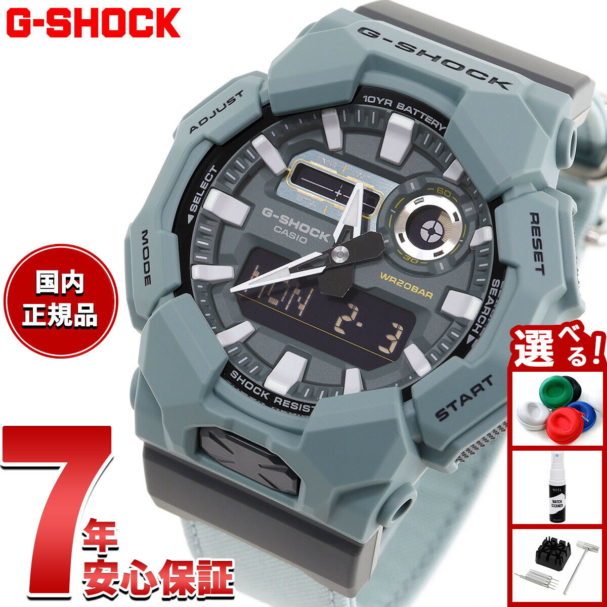 ↑↑↑正確な在庫状況は上記バナー「在庫状況を確認する」をクリックして頂き、必ずご確認ください。 長期保証をご希望のお客様は下記の表より「商品+長期保証」のページへ移動してご注文ください。※長期保証は法人加入や業務使用、譲渡や再販はご利用いただけません。 ■独自の樹脂成形技術による立体的な時分針と力強いインデックスを採用したG-SHOCKのNewスタンダードモデルGA-700■トレーナーやパーカーなどのストリートファッションの定番アイテムと相性の良いカラーに仕上げました■スタンダードにふさわしく、カジュアルスタイリングの幅を広げるカラーの登場ですベルト調整は承っておりません。メーカー(輸入時計は、正規代理店・特約店)からの直接仕入れ商品です。メーカー保証をお付けしております。GA7007AJFムーブメント:クオーツ式キャリバー:5522シリーズ名:ジーショック表示方式:デジタル/アナログ防水機能:20気圧防水ライト:○電波自動修正機能:-電池寿命:5年精度:月差±15秒バンドアジャスト:-バンド中留:-素材 ケース:樹脂 ガラス:無機ガラス バンド:樹脂機能 ワールドタイム:世界48都市(31タイムゾーン、サマータイム設定機能付き)+UTC(協定世界時)の時刻表示、UTCダイレクト呼出機能、ホームタイムの都市入替機能 ストップウォッチ:1/100秒、24時間計、スプリット付き、時刻モードからのワンプッシュ計測スタート付き、ターゲットタイム報知機能 タイマー:セット単位:1分、最大セット:60分、1/10秒単位で計測 時刻アラーム:5本(1本のみスヌーズ機能付き)・時報 カレンダー:○ 日付表示:○ 曜日表示:○ 耐衝撃構造(ショックレジスト) 針退避機能 フルオートカレンダー 12/24時間制表示切替 操作音ON/OFF切替機能保証期間:-年本体寸法:縦 57.5×横 53.4×厚さ 18.4mm バンド長:-mm本体質量:約69g付属品 保証書アナログ/デジタルのコンビネーションモデルGA-700が登場