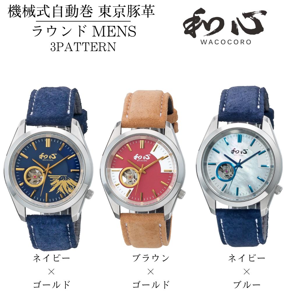 腕時計 WACOCORO 和心 3針 機械式自動巻 東京豚革 ラウンド 国内正規品 メンズ 3パターン | うで時計 PIGSKIN 5気圧防水 腕の動きに合わせて巻き上げ ステンレス ケース 東京豚革バンド サファイアガラス ピッグスキン 丈夫 シンプル ナチュラル プレゼント インテック