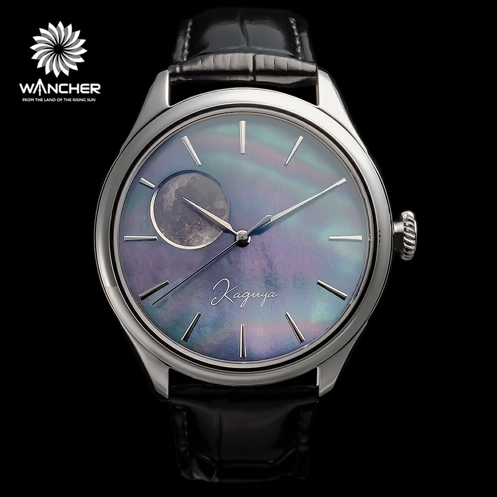 最新作 ワンチャー「ドリームウォッチ KAGUYA」ムーンフェイズ グレー 幻想的マザーオブパール文字盤【オリジナル 腕時計 正規品 ハイビートムーブメント Wancher ブランド 保証 メカニカル 機械式 自動巻き 藍 白蝶貝 パール 青 蒼 月 月相 宇宙 ユニセックス 送料無料】