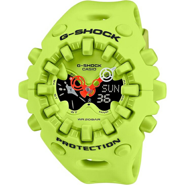 商品情報素材/材質●ケース・ベゼル材質:樹脂 ●バンド:樹脂バンド ●ガラス:無機ガラス、球面・曲面ガラスサイズ/寸法●ケースサイズ(縦×横×厚さ):49.1×58.2×19.6mm ●質量:74g ●バンド装着可能サイズ:145~215mmその他商品説明●耐衝撃構造●20 気圧防水機能●針退避機能(針が液晶表示と重なって見づらいときは、針を液晶表示の上から一時的に退避させることができます)●ワールドタイム:世界48 都市(31 タイムゾーン、サマータイム設定機能付き)+ UTC(協定世界時)の時刻表示●ストップウオッチ(1/100 秒(1 時間未満)/1 秒(1 時間以上)、24 時間計、スプリット付き)●タイマー(セット単位:1 秒、最大セット:24 時間、1 秒単位で計測)●時刻アラーム5 本・時報●フルオートカレンダー●12/24 時間制表示切替●操作音ON/OFF 切替機能●ダブルLED ライト:文字板用LED ライト(スーパーイルミネーター、残照機能、残照時間切替(1.5 秒/3 秒)付き)、LCD 部用LED バックライト(スーパーイルミネーター、残照機能、残照時間切替(1.5 秒/3 秒)付き)●電池寿命約10 年※電池寿命はモニター電池の為、生産時からの起算となります注意●モニター発色の具合により色合いが異なる場合がございます。【国内正規品】CASIO G-SHOCK カシオ ジーショック GA-V01-9AJF メンズ イエロー 衝撃の影響を受けやすい針をシャフトに固定せず、磁石の力で取り付けるマグネティックホールディング構造を開発 タフネスを追求し進化を続けるG-SHOCKから、構造とデザインにこだわったシリーズのご紹介です。エッジの効いたパーツを組み合わせた有機的な外装フォルム、2つの穴が大きな特徴となっている新開発のショックリリース針など、今までの常識を覆す斬新な発想で、強さを求めて挑戦を続けるG-SHOCKのアイデンティティを形にしました。モジュールを保護するセンターケースを、ベゼル・バンド一体構造の外装パーツでカバー。大型の立体インデックスをガラス上面に配置することで、衝撃を緩和するバンパーの役割を持たせました。G-SHOCK独自の耐衝撃性能をキープしながら、ユニークかつ力強い外装デザインを実現しています。衝撃の影響を受けやすい針をシャフトに固定せず、磁石の力で取り付けるマグネティックホールディング構造を開発しました。この構造で取り付けたショックリリース針(分針)は、磁力で固定されているため、受けた衝撃を受け流すことができます。本構造を採用することで、針の大型化やデザインの自由度を上げることが可能になりました。 5