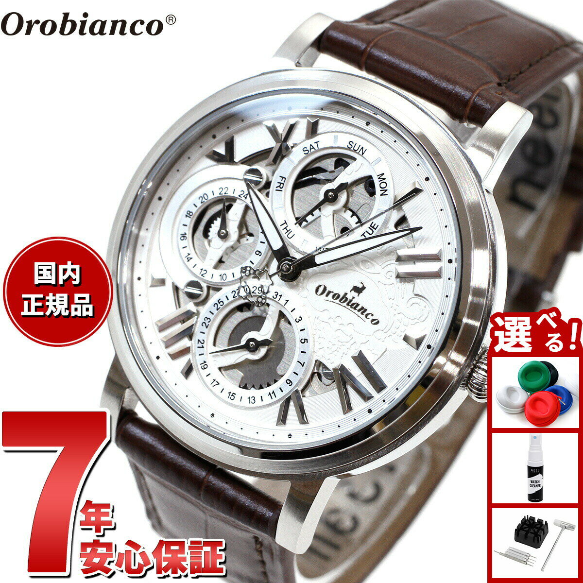 メーカー希望小売価格はメーカーサイトに基づいて掲載していますこの商品のお問い合わせ番号CPR-item-69847■ 商品詳細説明 オロビアンコ[Orobianco]イタリアらしいアンティークな様式美に現代の芸術性が加わったデザイン。革の繊細なアレンジとシルバーの趣ある造形が上品なカジュアルさを醸し出すセンス。そして日本の職人の手によるこだわりの技術。「Orobianco」の持つ、軽快で洒落た雰囲気を取り入れたトレンドに左右されない大人が身に着けるジュエリーです。ワンポイントのスケルトンデザインが施された大き目のフェイスに、ローマン数字の文字盤。クラシカルなデザインに遊び心が感じられる「ORAKLASSICA」裏側もスケルトン仕様というジャコモ氏のこだわりが詰め込まれたモデルです。映画の中で見るような構造美が映える逸品です。型番OR002-2ケース材質:ステンレススチールサイズ約:径41mm×厚:10mm重さ:約52gベルト幅:20mmベルト材質:レザーカラー:ブラウンベルト腕周り最少:14cmベルト腕周り最大:19.5cmムーブメントクオーツ(電池式)機能風防:ミネラルガラス日付・曜日表示24時間表示オープンハート防水機能防水性:日常生活用強化防水付属品Orobianco純正BOX保証書取扱説明書※説明書・保証書に関して入荷時期により仕様、内容が一部異なる場合がございます。予めご了承をお願い致します。また、ブランドにより説明書兼保証書が付属する場合がございます。予めご了承をお願い致します。