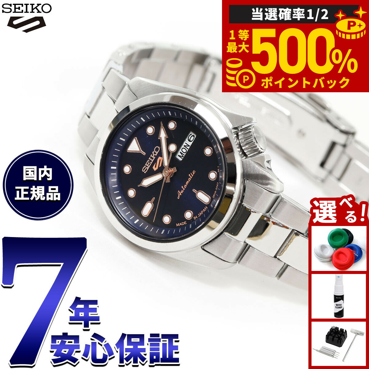国内未発表モデルとなるSKXシリーズ(28mm)が登場。スポーティなダイヤルレイアウトが魅力的なスモールサイズが特徴。4R36と同じスペックを持った2R06を搭載し、ケース径28mmにダウンサイジング。海外市場で定番となる人気のカラーリングを採用し、ゴールドのアクセントカラーがポイント。メタルブレスレットの中駒を鏡面に仕上げ、スポーティながらも華やかな印象を演出。商品名セイコー5 スポーツ SEIKO 5 SPORTS 自動巻き メカニカル 腕時計 レディース セイコーファイブ スポーツ SKX Series SRRA007商品番号SRRA007ブランドセイコー 5スポーツ SEIKO 5 SPORTSムーブメントメカニカル 自動巻(手巻つき) キャリバー:2R06駆動期間:最大巻上時約40時間持続精度:日差+45秒〜−35秒石数 21石秒針停止機能日常生活用強化防水(10気圧)カレンダー(日付・曜日)機能つきルミブライト:あり(針・インデックス)耐磁:ありスクリューバックバンドアジャスト:ピン方式MADE IN JAPAN風防素材ハードレックスケース素材縁部ステンレススチール 胴部ステンレススチール 裏ぶた部ステンレススチールケースサイズ33.1×28mmケース厚11.2mmバンド素材ステンレススチールバンド留金タイプワンプッシュ三つ折れ方式バンド幅14mm文字盤カラーネイビー保証期間メーカー3年間保証付属保証書 / 専用BOXその他のサービスメーカー希望小売価格はメーカーサイトに基づいて掲載していますセイコー5 スポーツ SEIKO 5 SPORTS 自動巻き メカニカル 腕時計 レディース セイコーファイブ スポーツ SKX Series SRRA007 国内未発表モデルとなるSKXシリーズ(28mm)が登場。スポーティなダイヤルレイアウトが魅力的なスモールサイズが特徴。4R36と同じスペックを持った2R06を搭載し、ケース径28mmにダウンサイジング。海外市場で定番となる人気のカラーリングを採用し、ゴールドのアクセントカラーがポイント。メタルブレスレットの中駒を鏡面に仕上げ、スポーティながらも華やかな印象を演出。