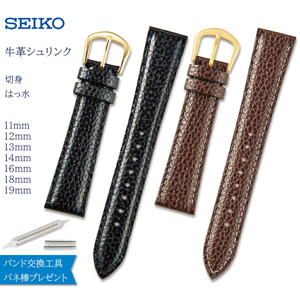 ブランドセイコーバンド SEIKO商品名牛革シュリンク -切身 はっ水-材質/裏材牛革/テグラン【テグラン】抗菌防臭加工が施された起毛タイプの人工皮革。仕立て方【切身】最も一般的に使われているタイプです。芯材に表材と裏材を高周波加工で接着し、バンドの形状に切断して作ります。裁断面が横から見えますので、他の仕立てと区別ができます。シャープな味が表現できます。【甲丸タイプ】バンド幅(バンド幅-美錠幅)黒 ブラック11mm-9mm【DAD8R】 12mm-10mm【DAD9R】13mm-10mm【DAE0R】 14mm-10mm【DXG8】16mm-14mm【DAE2R】 17mm-14mm【DAE3R】18mm-15mm【DAE4R】 19mm-15mm【DXG7】こげ茶 ダークブラウン11mm-9mm【DAE5R】 12mm-10mm【DAE6R】13mm-10mm【DAE7R】 14mm-10mm【DXH0】16mm-14mm【DAE9R】 17mm-14mm【DAF0R】18mm-15mm【DAF1R】 19mm-15mm【DXG9】長さ(剣先側/美錠側)バンド幅11~14mm:約110mm/65mmバンド幅16~19mm:約115mm/70mm厚みバンド幅11~14mm:約3.0mmバンド幅16~19mm:約3.5mm商品説明シュリンクタイプの牛革バンドです。特徴的な柄と、リーズナブルな価格が魅力です。