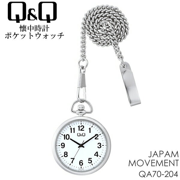 ≪シチズン≫ 懐中時計 ポケットウォッチ クオーツ 非防水 シンプル QA70-204確かな品質で安心してご使用いただける、シチズンQ&Qの懐中時計まさに粋なアイテムとして密かな話題を呼んでいる懐中時計ですが、つい時刻しか目にしなくなってしまう腕時計とは違い、手の中に握る時計の感触、そしてポケットの中で感じる時計の鼓動に、時間という概念の深さを考えさせてくれるクラシックアイテム。[仕様] クオーツ 非防水 懐中時計 裏蓋ステンレス[サイズ] ケース:約縦40mm×横40mm×厚8.7mm 重量:33g(チェーン除く) チェーン:30cm(フック除く) チェーン重量:1.6g≪シチズン≫ 懐中時計 ポケットウォッチ クオーツ 非防水 シンプル QA70-204 確かな品質で安心してご使用いただける、 シチズンQ&Qの懐中時計まさに粋なアイテムとして密かな話題を呼んでいる懐中時計ですが、 つい時刻しか目にしなくなってしまう腕時計とは違い、 手の中に握る時計の感触、そしてポケットの中で感じる時計の鼓動に、 時間という概念の深さを考えさせてくれるクラシックアイテム。 時間を一目で視認できる大き目の見やすい文字盤が特徴の、 これぞ懐中時計とも言えるシンプルな王道デザイン。プレゼントやギフトにも喜ばれる嬉しいアイテムです。 【仕様】 クオーツ 非防水懐中時計裏蓋ステンレス【サイズ】ケース:約縦40mm×横40mm×厚8.7mm 重量:33g(チェーン除く) チェーン:30cm(フック除く) チェーン重量:1.6g
