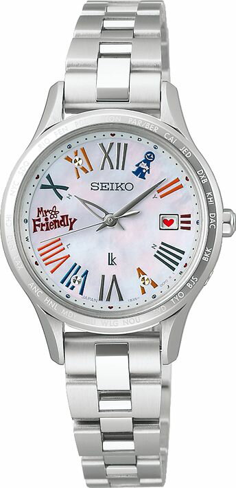 駆動方式 ソーラー電波 駆動期間:フル充電時約6ヶ月間 パワーセーブ時約1.5年 ケース幅 27.5×35mm ケース厚 7.6mm ケース素材 ステンレススチール(プラチナダイヤシールド) バンド素材 ステンレススチール(ワンプッシュ三つ折れ方式中留) 防水 10気圧 重さ 50g 備考 サファイアガラス(スーパークリアコーティング) 裏ぶた「LIMITED EDITION」表記 白蝶貝ダイヤル らくらくアジャストバンド 替えベルト(簡易着脱レバー式バンド) Comfotex 過充電防止機能 即スタート機能 パワーセーブ機能 フルオートカレンダー機能(2099年12月31日まで) ワールドタイム機能(25タイムゾーン) 電波修正機能(日本・中国・アメリカ・ドイツの標準電波を受信) 自動受信機能 強制受信機能 受信結果表示機能 針位置自動修正機能 カレンダー(日付)機能つき(30日のみハートモチーフ表示) 保証期間 正規メーカー保証3年■ルキア誕生30周年を祝福し、“BE HAPPY!”をテーマにしたMR.FRIENDLYとのコラボレーションモデルが登場。 ■MR.FRIENDLYロゴをオマージュしたオリジナルローマフォントを、落ち着きのあるレインボーカラーでレイアウト。 ■3時位置のカレンダー表示は30周年にちなんで30日にハートモチーフが現れる。 ■付け替えストラップは、トリコロールカラーが映えるベージュでダイヤルカラーに合わせたステッチ。