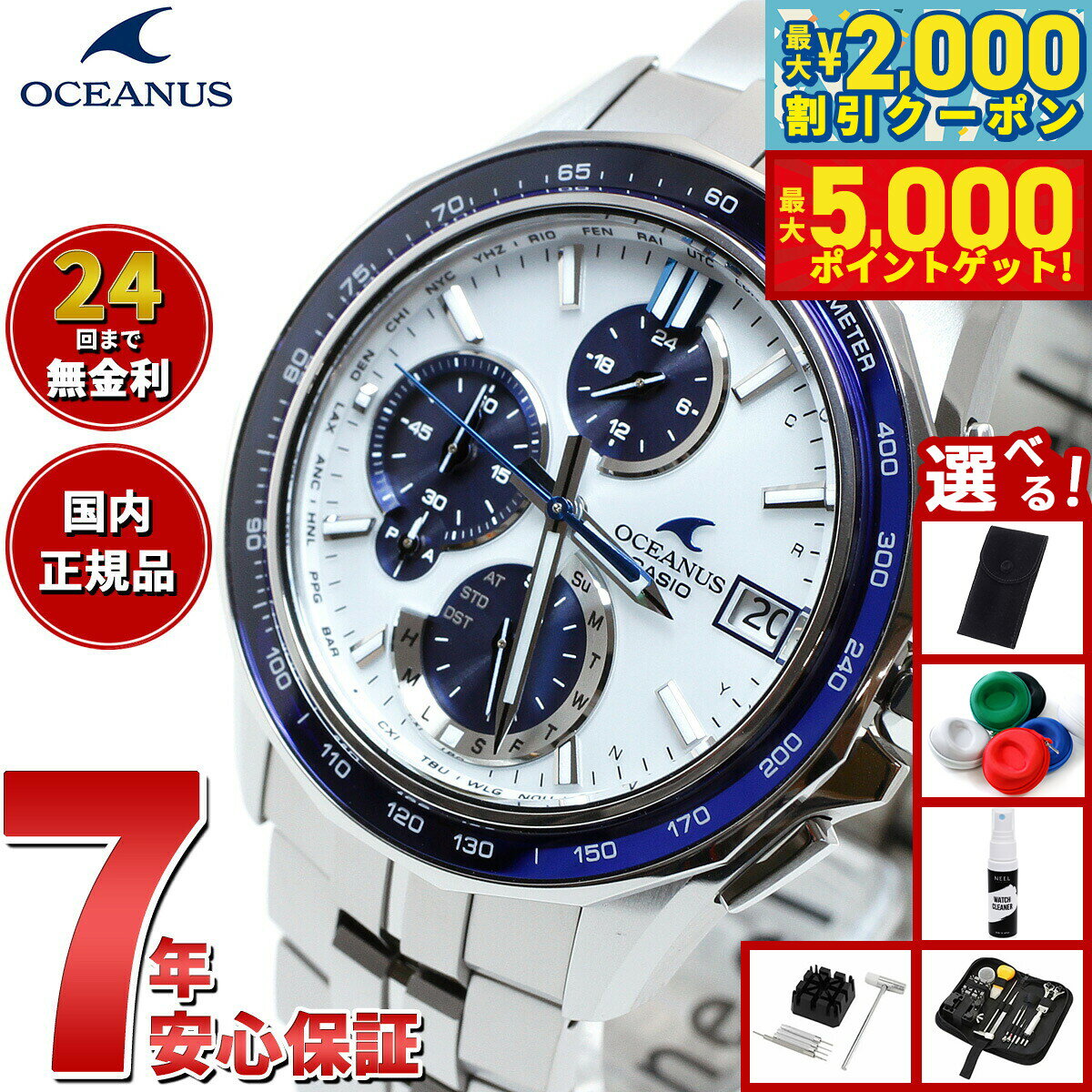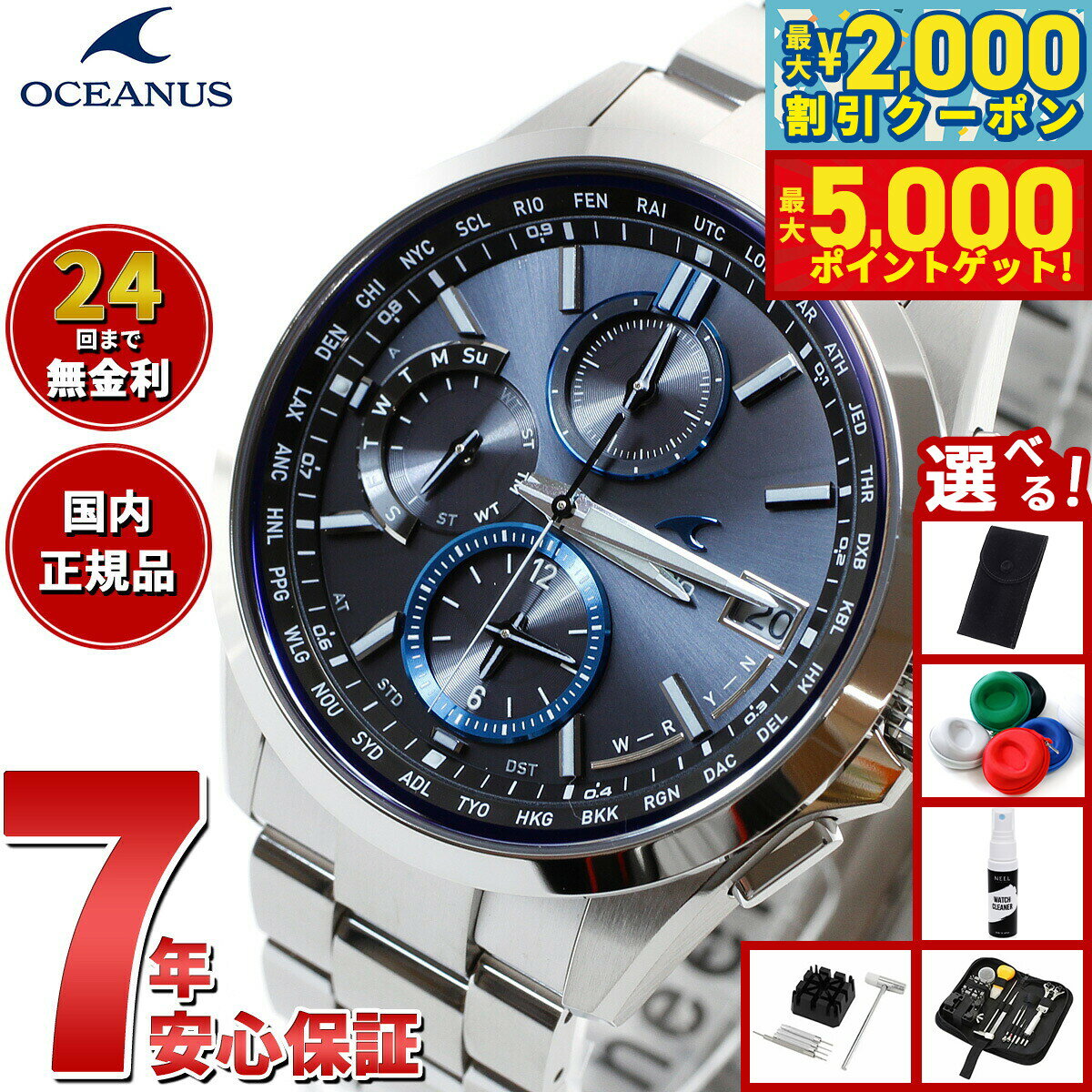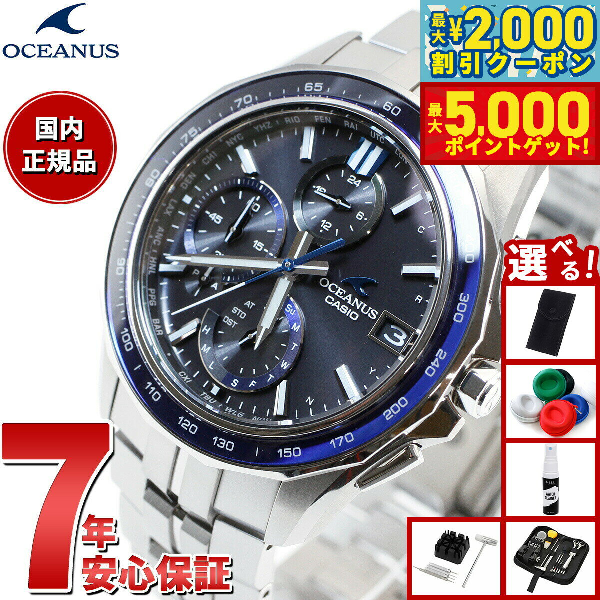「入荷次第出荷」表記の商品のうち、仕入先にて在庫切れとなっていた場合、 一部商品を除き約1ヶ月以上お時間を頂く場合がございます。予めご了承ください。 お急ぎのお客様は、在庫状況を確認させて頂きますので、ご購入前にお問い合わせ下さいます様お願い申しあげます。OCEANUS 3針モデル■オシアナスのクラシックラインから、シンプルな3針モデルに上質な仕上げ・素材を採用し、多機能と優れた操作性を両立する「スマートアクセス」を搭載したモデルが登場。■スマートアクセスにより、りゅうずを引く・回す、の動作だけでワールドタイム機能の操作が可能となり、海外で使用する際も簡単に時差修正が行えます。時・分・秒針、日付が独立駆動し、日をまたぐ時差がある都市の時刻も素早く表示できます。更に10.5mmの薄型化も実現しました。■光の反射を抑え、美しさと見やすさを両立した、デュアルカーブサファイアガラスを風防に採用。また、ゆがみの少ない上質な仕上げのザラツ研磨や、美しく装着感の良い桟残し構造のバンドを採用するなど、細部にまで上質さにこだわりました。■スポーティなブラック×ブルーをラインアップ。オシアナスブルーが際立つ3針オシアナスです。 メーカー保証年数 3年※本商品が対象となるクーポンは、その期間終了後、同一内容でのクーポンが継続発行される場合がございます。