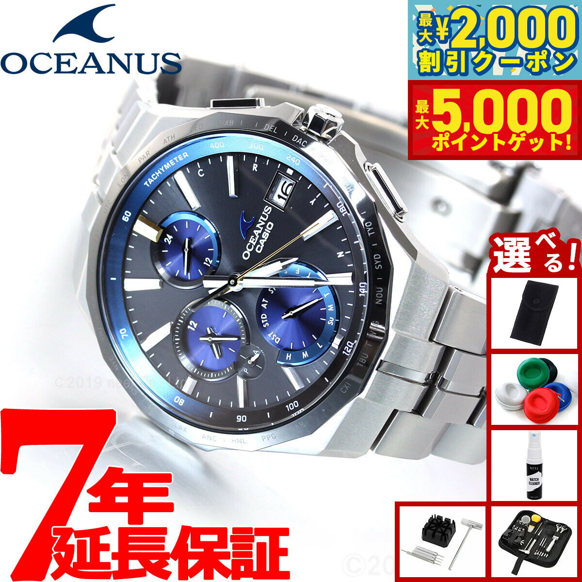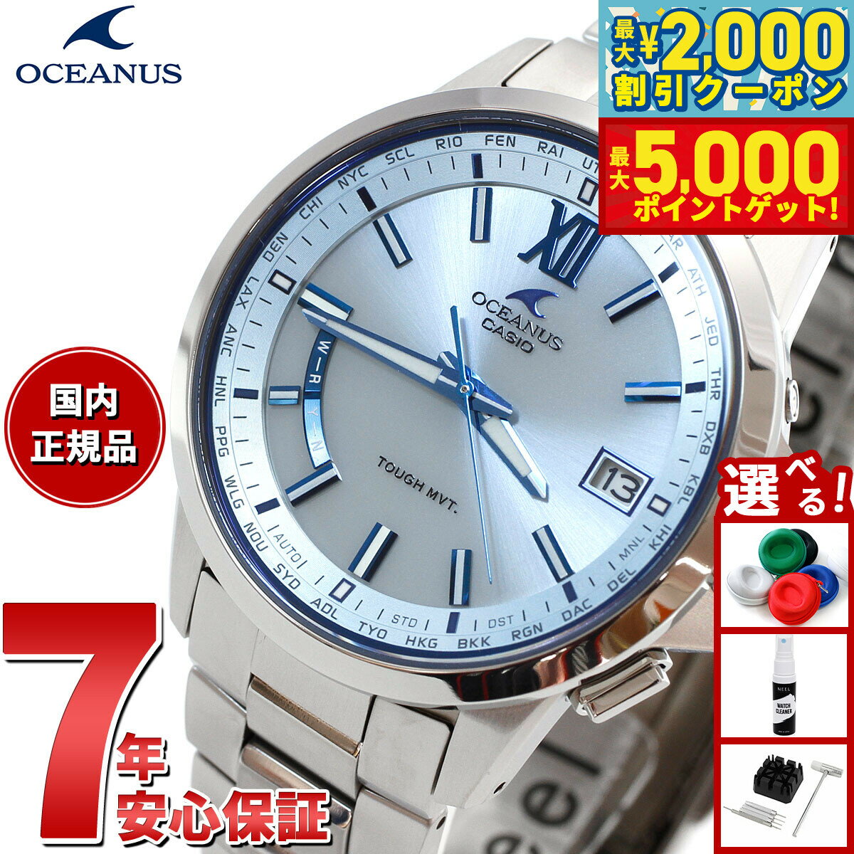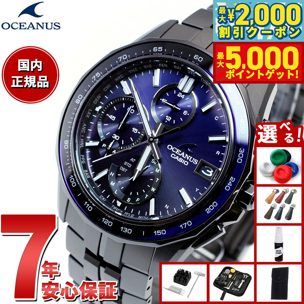 「入荷次第出荷」表記の商品のうち、仕入先にて在庫切れとなっていた場合、 一部商品を除き約1ヶ月以上お時間を頂く場合がございます。予めご了承ください。 お急ぎのお客様は、在庫状況を確認させて頂きますので、ご購入前にお問い合わせ下さいます様お願い申しあげます。OCEANUS 3針モデル■オシアナスのクラシックラインから、シンプルな3針モデルに上質な仕上げ・素材を採用し、多機能と優れた操作性を両立する「スマートアクセス」を搭載したモデルが登場。■スマートアクセスにより、りゅうずを引く・回す、の動作だけでワールドタイム機能の操作が可能となり、海外で使用する際も簡単に時差修正が行えます。時・分・秒針、日付が独立駆動し、日をまたぐ時差がある都市の時刻も素早く表示できます。更に10.5mmの薄型化も実現しました。■光の反射を抑え、美しさと見やすさを両立した、デュアルカーブサファイアガラスを風防に採用。また、ゆがみの少ない上質な仕上げのザラツ研磨や、美しく装着感の良い桟残し構造のバンドを採用するなど、細部にまで上質さにこだわりました。■スポーティなブラック×ブルーをラインアップ。オシアナスブルーが際立つ3針オシアナスです。 メーカー保証年数 3年※本商品が対象となるクーポンは、その期間終了後、同一内容でのクーポンが継続発行される場合がございます。