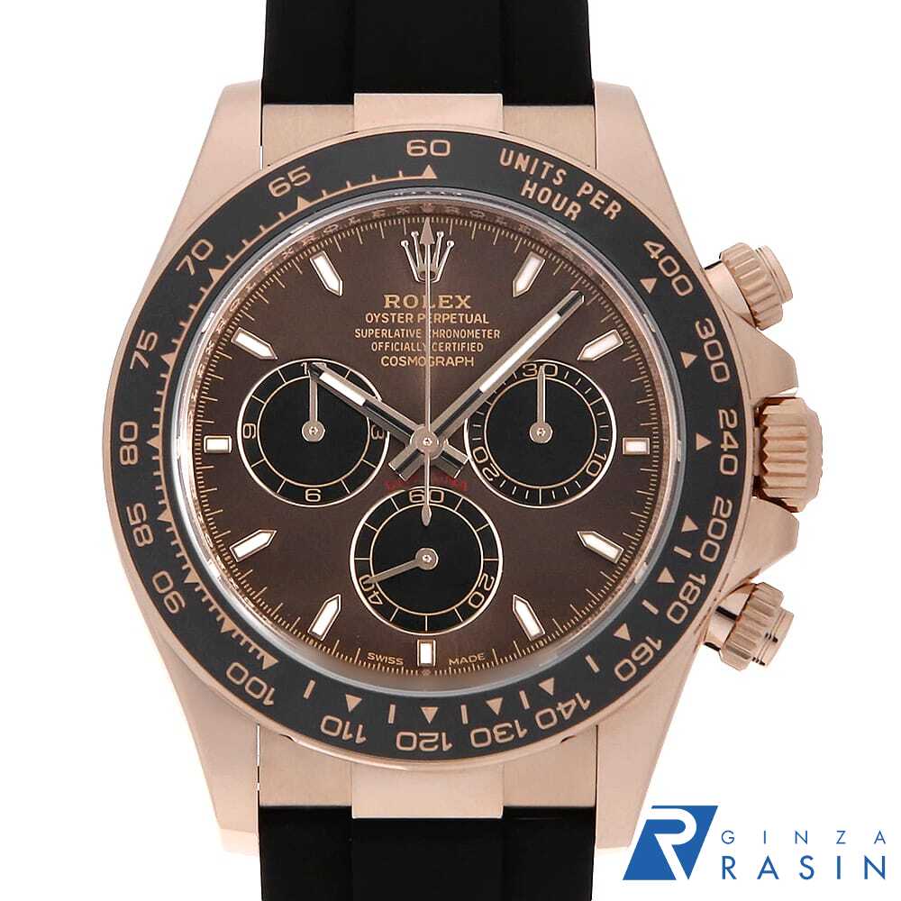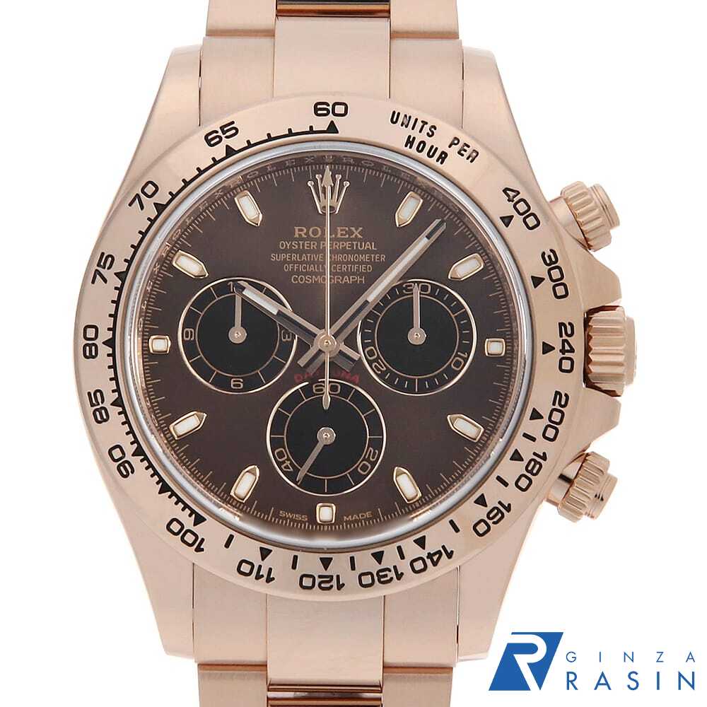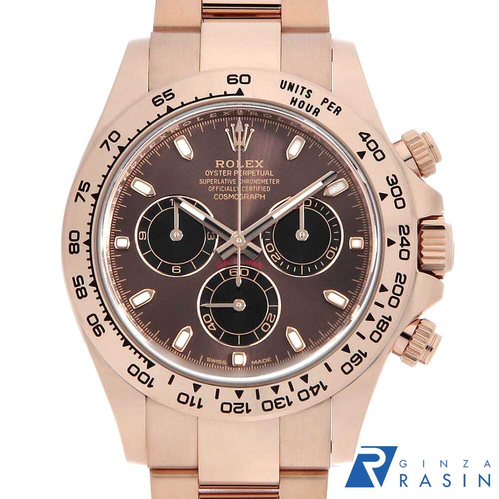 お問合せ用コード U-116505CB-3 ブランド ROLEX(ロレックス) 型番 116505 商品名 コスモグラフ デイトナ 材質 エバーローズゴールド/ERG 文字盤 チョコレートブラウン/Chocolate Brown ムーブメント 自動巻き/Self-Winding サイズ ケース:直径 40mm (リューズ含まず) 腕周り:19.5cm 全重量:215g 付属品 外箱(ダメージ有) / 内箱(ダメージ有) / 取扱説明書 / 保証書(発行日付 2023年9月) メンテナンス情報コンディション 外装仕上げ/機械点検 (当店にて 2025年11月) ケース: 目立つ傷やダメージなどはなく良い状態です。 ベゼル: 目立つ傷やダメージなどはなく良い状態です。 ガラス: 目立つ傷やダメージなどはなく良い状態です。 針・文字盤: 目立つ傷やダメージなどはなく良い状態です。 ベルト: 目立つ傷やダメージなどはなく良い状態です。 当社保証 内部機械の自然故障について ご購入日より 1年間詳しくはこちらをクリック モデル情報 腕時計を代表する傑作とも言えるコスモグラフ・デイトナ。細部に至るまで丁寧に仕上げられたケースには、従来のピンクゴールドに微量のプラチナが入ったエバーローズゴールドを使用しており、輝きの衰えない上品で鮮やかな色味が魅力です。プッシュボタンで操作可能な秒・分・時のクロノグラフや、タキメーターとして機能する目盛り付きベゼルを備えており機能性も抜群です。 個別コード 0050ROAU0230 販売店舗:銀座rasin(銀座らしん、銀座ラシン) 新宿店