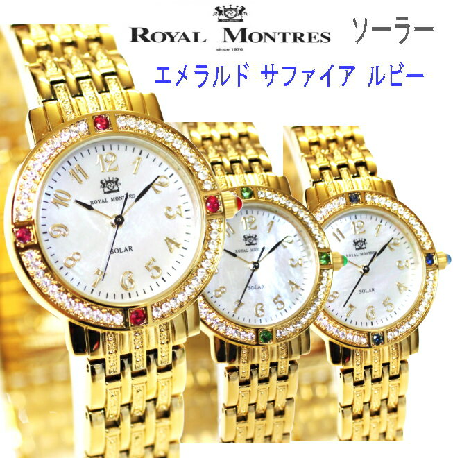 レディース腕時計 ソーラー サファイア エメラルド ルビー 各4石 【宝石鑑別書付き】 ジュエリーウォッチ 宝飾時計 ゴールドカラー 金色 アラビア シェル ロイヤルモントレス RM-0015 正規品 電池交換不要 人気 バレンチノ ラグジュアリー ブランド きれい 高級感ラ エコ