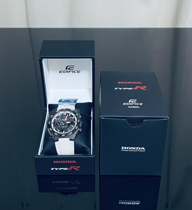 ※当商品は代金引換の決済方法はご指定頂けません。前払いの決済方法にてご注文をお願い申し上げます。 Hondaの歴代TYPE Rへのリスペクトを表してHondaとコラボレーションした「EDIFICE Honda TYPE R Edition」 高機能モータースポーツウオッチEDIFICEから、Hondaの歴代TYPE Rへのリスペクトを表してHondaとコラボレーションした「EDIFICE Honda TYPE R Edition」をご紹介します。 Honda TYPE Rはホンダ車のスポーツモデルの最高峰。レーシングカーが持つ速さと圧倒的なドライビングプレジャーの両立を狙う特別なロードカーで、そのTYPE Rにのみ「赤バッジ」と呼ばれる真紅のエンブレムが与えられます。EDIFICEの開発チームはHonda TYPE Rの開発責任者からのヒアリングを経てTYPE Rの開発テーマである「本質」と「官能」に沿ってEDIFICE Honda TYPE R Editionを開発しました。 「本質」として追求したのは時計の視認性と快適な装着性。インデックスと針に蓄光を施し視認性を向上。革バンドにDバックルを採用し、裏面にアルカンターラ(R)を用いて装着性を高めました。 「官能」として追求したのはHonda TYPE Rを身につけるということ。「赤バッジ」「チャンピオンシップホワイトの本物の塗料」「Rマークを配したボタン」「遊環と裏蓋のTYPE Rロゴ」「TYPE Rの内装に使われるアルカンターラ(R)と赤いステッチ」など多くのTYPE Rの象徴がこのコラボレーションウオッチに施されています。また歴代のTYPE Rの型式番号を革バンドにプリントし、TYPE R全てへのリスペクトを表現します。 時計のケースはカーボンファイバー強化樹脂製。Bluetooth(R)によるスマートフォンリンク、ソーラー駆動、高輝度なLEDライト、サファイアガラスを装備。スマートフォンアプリとの連携により現在時刻の正確性、ワールドタイムやアラームなど機能の使い勝手の良さを誇ります。 【HONDA TYPE R】 Honda伝統のレーシングテクノロジーを注ぎ込み究極のロードカーを目指して開発されるHonda車スポーツモデルの最上位グレード。レーシングカーが持つ速さと圧倒的なドライビングプレジャーをDNAに、30年以上の進化を通じて数々の名車を世に送り出してきました。通称「赤バッジ」と呼ばれる真紅のエンブレムと、F1(TM)への挑戦を起源とするチャレンジングスピリットの象徴であるアイボリーホワイト「チャンピオンシップホワイト」はTYPE Rのみに与えられます。 ●バンド:本革バンド ●長さ:175~215mm/25.6mm ●ケースサイズ:47.6×48.2×11.9mm ●質量:68g ●タフソーラー(ソーラー充電システム) ●10気圧防水機能 ●モバイルリンク機能(対応携帯電話とのBluetooth(R)通信による機能連動) ●針退避機能(針が液晶表示と重なって見づらいときは、針を液晶表示の上から一時的に退避させることができます) ●ワールドタイム:世界38都市(38タイムゾーン、サマータイム自動設定機能付き)+UTC(協定世界時)の時刻表示、ホームタイムの都市入替機能 ●ストップウオッチ(1/100秒(1時間未満)/1秒(1時間以上)、24時間計、ラップ/スプリット付き) ●タイマー(セット単位:1秒、最大セット:60分、1秒単位で計測、予告音付き) ●時刻アラーム5本(予告音付き)・時報 ●バッテリーインジケーター表示 ●パワーセービング機能(暗所では一定時間が経過すると表示を消して節電します) ●フルオートカレンダー ●12/24時間制表示切替 ●操作音ON/OFF切替機能 ●カウントダウンタイマー予告音ON/OFF切替機能 ●曜日表示(英・西・仏・独・伊・露の6ヵ国語切替) ●ダブルLEDライト:文字板用LEDライト(スーパーイルミネーター、残照機能、残照時間切替(1.5秒/3秒)付き)、LCD部用LEDバックライト(スーパーイルミネーター、残照機能、残照時間切替(1.5秒/3秒)付き) ●フル充電時からソーラー発電無しの状態での駆動時間機能使用の場合:約7ヵ月/パワーセービング状態の場合:約18ヵ月 ---------------- 発売日 2023年11月 状 態: 新品 ---------------- ※商品本体のキズ、塗装不良、部品不足等の初期不良やご意見などは、商品に記載されているメーカーのサポートセンターにご確認ください。 ※パッケージは商品本体の保護材ですので、本体に影響を及ぼすような破損を除き、交換・返品対応対象外となりますことをあらかじめご了承下さい。 ※当商品は希少品につき、定価以上での販売の場合がございます。予めご了承ください。 ※ご注文確定後のキャンセル・返品・数量変更等はお受けできません。 ※即納商品につきまして、当店は毎週日曜日は発送業務を行っておりません。そのため、翌営業日以降の発送とさせて頂きます。 ※お客様都合による返品はできません。また、初期不良の場合はお客様側でメーカーへお問合せください。 詳しくはこちらのページをご参照下さい。