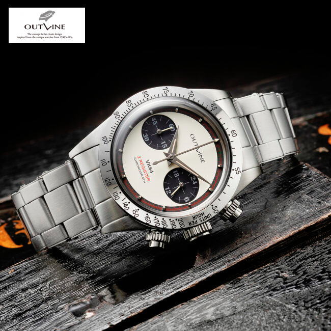 アウトライン 2レジスタークロノ・シリーズIII パンダ クォーツ腕時計 国内正規品 SEIKO製VK64を搭載した大ヒット作の第3弾。2レジスタークロノ・シリーズ III SEIKO製メカ・クォーツクロノ・VK64を搭載した2レジスタークロノの第3弾。その名もシリーズ III です。これは入荷するとすぐに完売するほどの大ヒット作で常に品薄状態が続くシリーズ I 、その新バージョンになります。 デザインのモチーフとなったのは前作と同様にポールニューマンの愛称で知られる手巻きの傑作クロノグラフ。その中でもネジ留め式のプッシュボタンを採用してクロノグラフでありながら当時50m防水を実現した実用クロノの傑作と呼ばれる70年代の第3世代を再現しました。 前作は黒ベゼルなのに対して今作は鏡面のメタルベゼルを採用している点が大きな違いです。このモデルはホワイト文字盤に対して二つのインダイアルにブラックを採用した通称“パンダダイアル”と呼ばれる人気の文字盤です。 当時からベゼルには黒ベゼルとメタルベゼルの2種類が併売されていたこともあって、前作をリリースした際に購入したお客様より「メタル仕様も出してほしい」という要望が多数寄せられたことから今回製品化に至りました。 基本とする文字盤自体のデザインは前作と変わりませんが、文字盤外周の分目盛りは一般的な黒や白抜きではなく通称「赤巻き」と呼ばれる目盛りを赤にプリントした仕様を採用。前作は黒地に白インダイヤルの逆パンダタイプだけだったものを、今作ではパンダタイプにも採用しました。 【“2レジスタークロノ・シリーズIII ”8つのこだわり】 【1】ドーム形プラスチック風防採用で古典的な雰囲気を強調 ベースとなった1970年代の傑作クロノグラフの風防ガラスは、年代的にドーム形ではなくボックス形でしたが、今回はよりクラシカルな雰囲気を強めるために、さらに古い時期の時計に見られたドーム形の風防を採用、しかもその当時と同じようなアクリルガラスを使用することでグッと古典的な雰囲気を強調しています。また、リベットブレスとケースラグをつなぐ弓カンというパーツも2レジスタークロノ用に専用設計しているため、リベットブレスとケースの接合部分もピッタリと合っていることが見て取れます。 【2】オリジナルに近い薄いケースフォルム 裏ブタからベゼルまでのケース厚は11.9mm、ドーム形風防を含んでも13.1mmとオリジナルに近いサイズを実現。リューズ、プッシュボタンのトップおよびケースサイドはリベットブレスのコマと同様に鏡面仕上げを施しています。 【3】プッシュボタンも当時と同じネジ留め式を採用 2時位置と4時位置にあるクロノグラフの操作用プッシュボタンをご覧ください。3時位置にある時刻調整用のリューズはネジ込み式なのに加えて、こちらも70年代のオリジナル同様にネジ留め式にしました。写真左のネジが締まった状態ではボタンはロックされていて押せません。ネジを緩めた写真右の状態でロックが解除され、プッシュボタンを押すことができるようになり、クロノグラフのスタートストップ&リセットが行えます。 【4】オリジナルの象徴となっている通称「赤巻き」を再現 文字盤に立体感をもたせるために、二つのインダイアルは文字盤の面よりも1段下げて単調にならないよう配慮しました。しかも、写真ではわかりにくいかもしれませんが、インダイアルには細かな同心円状の装飾を施しています。また、文字盤外周にある分目盛りは時計愛好家の間で「赤巻き」と呼ばれているレッドプリンを採用。70年代のオリジナルの象徴的なディテールを再現しています。 【5】製造番号を大きく刻印しビッグナンバーを表現 裏ブタ中央には製造番号が大きく刻印されます。これはアンティークロレックス 愛好家の間で言われるところの“ビッグナンバー”を表現したものです。 【6】オリジナルのリベットブレスはアウトラインだけ 1950年代にロレックスが採用していたリベットブレスを忠実に復刻。リベットの頭に溝がある四つのコマは、マイナスドライバーを使えば自分自身でコマ詰めができる仕組みになっており、これは他のリベットブレスにはないアウトラインだけの仕様です。 【7】シーンを選ばず着けられるクラシカルなデザインと程よいサイズ感 モノトーンで落ち着いた雰囲気に加えてメタルベゼルの程よい光沢感はアンティークの風合いを強めると同時にファッション性も高めます。加えてサイズも37.8mm径に厚さも約11.9mmと細身の日本人の手首にもすんなり納まる程よいサイズ感なのもこの2レジスタークロノシリーズの大きな魅力となっています。 【8】携帯用としても使える時計収納ケース 時計の箱といえば、時計を収納するだけのものが一般的で、それだと時計を取り出した後は無用の長物となることも多々あります。だとすれば収納するだけでなく、せっかくならケース単体でも常に活用できるものにすればいいじゃないかということで、持ち歩くとき