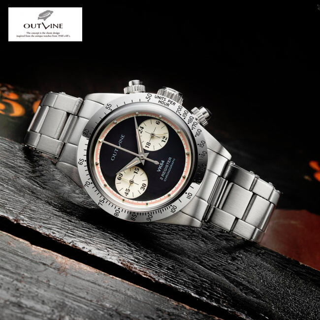 アウトライン 2レジスタークロノ・シリーズIII 逆パンダ クォーツ腕時計 国内正規品 SEIKO製VK64を搭載した大ヒット作の第3弾。2レジスタークロノ・シリーズ III SEIKO製メカ・クォーツクロノ・VK64を搭載した2レジスタークロノの第3弾。その名もシリーズ III です。これは入荷するとすぐに完売するほどの大ヒット作で常に品薄状態が続くシリーズ I 、その新バージョンになります。 デザインのモチーフとなったのは前作と同様にポールニューマンの愛称で知られる手巻きの傑作クロノグラフ。その中でもネジ留め式のプッシュボタンを採用してクロノグラフでありながら当時50m防水を実現した実用クロノの傑作と呼ばれる70年代の第3世代を再現しました。 前作は黒ベゼルなのに対して今作は鏡面のメタルベゼルを採用している点が大きな違いです。このモデルはブラック文字盤に対して二つのインダイアルが白い通称“逆パンダダイアル”と呼ばれる人気の文字盤です。 当時からベゼルには黒ベゼルとメタルベゼルの2種類が併売されていたこともあって、前作をリリースした際に購入したお客様より「メタル仕様も出してほしい」という要望が多数寄せられたことから今回製品化に至りました。 基本とする文字盤自体のデザインは前作と変わりませんが、文字盤外周の分目盛りは一般的な黒や白抜きではなく通称「赤巻き」と呼ばれる目盛りを赤にプリントした仕様を採用。前作は黒地に白インダイヤルの逆パンダタイプだけだったものを、今作ではパンダタイプにも採用しました。 【“2レジスタークロノ・シリーズIII ”8つのこだわり】 【1】ドーム形プラスチック風防採用で古典的な雰囲気を強調 ベースとなった1970年代の傑作クロノグラフの風防ガラスは、年代的にドーム形ではなくボックス形でしたが、今回はよりクラシカルな雰囲気を強めるために、さらに古い時期の時計に見られたドーム形の風防を採用、しかもその当時と同じようなアクリルガラスを使用することでグッと古典的な雰囲気を強調しています。また、リベットブレスとケースラグをつなぐ弓カンというパーツも2レジスタークロノ用に専用設計しているため、リベットブレスとケースの接合部分もピッタリと合っていることが見て取れます。 【2】オリジナルに近い薄いケースフォルム 裏ブタからベゼルまでのケース厚は11.9mm、ドーム形風防を含んでも13.1mmとオリジナルに近いサイズを実現。リューズ、プッシュボタンのトップおよびケースサイドはリベットブレスのコマと同様に鏡面仕上げを施しています。 【3】プッシュボタンも当時と同じネジ留め式を採用 2時位置と4時位置にあるクロノグラフの操作用プッシュボタンをご覧ください。3時位置にある時刻調整用のリューズはネジ込み式なのに加えて、こちらも70年代のオリジナル同様にネジ留め式にしました。写真左のネジが締まった状態ではボタンはロックされていて押せません。ネジを緩めた写真右の状態でロックが解除され、プッシュボタンを押すことができるようになり、クロノグラフのスタートストップ&リセットが行えます。 【4】オリジナルの象徴となっている通称「赤巻き」を再現 文字盤に立体感をもたせるために、二つのインダイアルは文字盤の面よりも1段下げて単調にならないよう配慮しました。しかも、写真ではわかりにくいかもしれませんが、インダイアルには細かな同心円状の装飾を施しています。また、文字盤外周にある分目盛りは時計愛好家の間で「赤巻き」と呼ばれているレッドプリンを採用。70年代のオリジナルの象徴的なディテールを再現しています。 【5】製造番号を大きく刻印しビッグナンバーを表現 裏ブタ中央には製造番号が大きく刻印されます。これはアンティークロレックス 愛好家の間で言われるところの“ビッグナンバー”を表現したものです。 【6】オリジナルのリベットブレスはアウトラインだけ 1950年代にロレックスが採用していたリベットブレスを忠実に復刻。リベットの頭に溝がある四つのコマは、マイナスドライバーを使えば自分自身でコマ詰めができる仕組みになっており、これは他のリベットブレスにはないアウトラインだけの仕様です。 【7】シーンを選ばず着けられるクラシカルなデザインと程よいサイズ感 モノトーンで落ち着いた雰囲気に加えてメタルベゼルの程よい光沢感はアンティークの風合いを強めると同時にファッション性も高めます。加えてサイズも37.8mm径に厚さも約11.9mmと細身の日本人の手首にもすんなり納まる程よいサイズ感なのもこの2レジスタークロノシリーズの大きな魅力となっています。 【8】携帯用としても使える時計収納ケース 時計の箱といえば、時計を収納するだけのものが一般的で、それだと時計を取り出した後は無用の長物となることも多々あります。だとすれば収納するだけでなく、せっかくならケース単体でも常に活用できるものにすればいいじゃないかということで、持ち歩くときにも便利な
