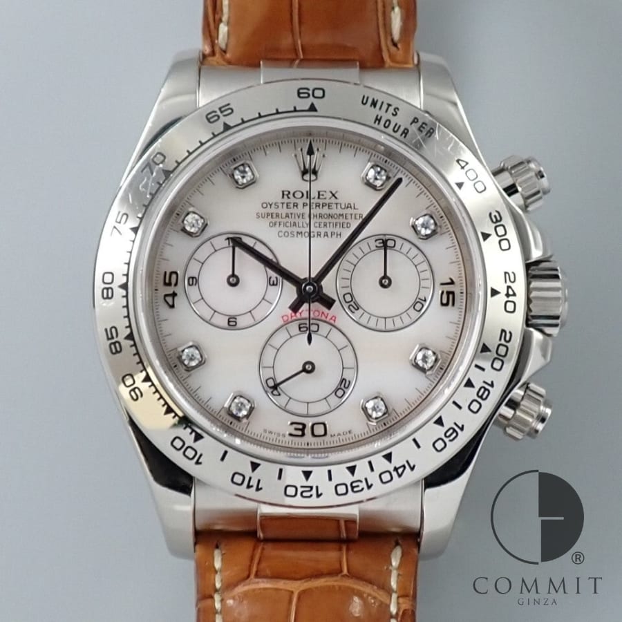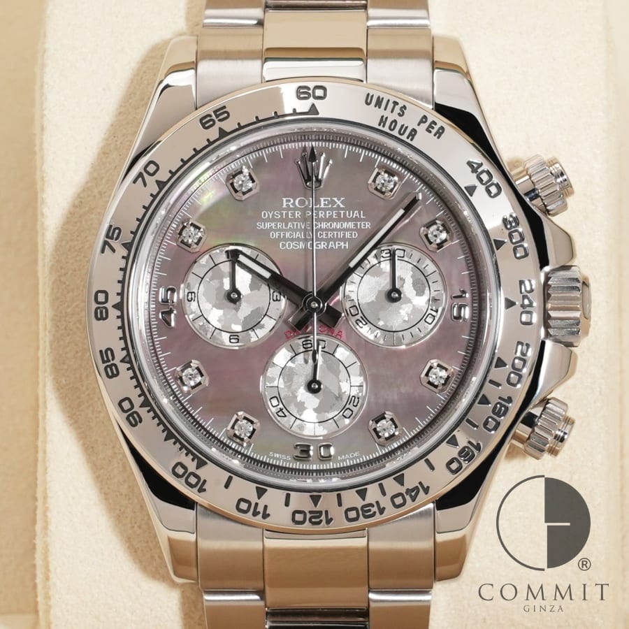 鑑定士からの一言弊社提携工房にて外装仕上げを行っておりますので、全体的に綺麗な状態の美中古品でございます。 ブラックシェル×8Pダイヤインデックスの文字盤は出回りが少なくなっており、保証書に文字盤カラーの記載がある仕様となっております。 付属品がしっかり揃っており、販売価格も抑えられたオススメ品です。 ※一部に研磨で取り切れなかったキズ残りがございます。 基本情報ブランドロレックスモデルデイトナ型番116509NG文字盤ブラックシェル素材18KWG状態美中古製造年度ランダム番保証書日付2015年12月駆動方式自動巻きキャリバー4130パワーリザーブ約72時間ケースサイズ40mm腕回り腕周り最大約18.5cm仕様・付属品夜光クロマライト防水100m付属品保証書;国際サービス保証書;箱;冊子;パスケース;クロノメータータグ;余りコマ各部コンディションダイヤル綺麗な状態針綺麗な状態風防10倍ルーペで見て目立つスレ・キズなしベゼル目立たない程度のスレ・キズありケース目立つスレ・キズなしブレスレット目立たない程度のスレ・キズありブレスレットのヨレヨレ全くなしバックル目立つスレ・キズなし裏蓋目立つスレ・キズなし保証当店保証期間12ヵ月