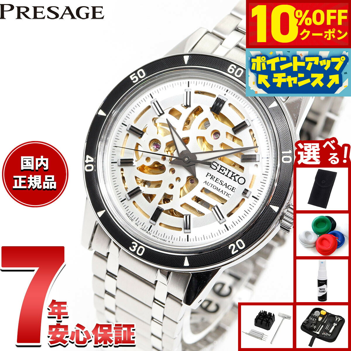 機械式の愉しさをダイレクトに伝える、Style60’sシリーズ初のスケルトンダイヤルモデルが登場。テーマは「Elegant yet Rugged」(エレガント イエット ラギッド)。ダイヤルの力強い略字やベゼル表示板といった、Style60’s本来の無骨な要素は残しつつも、エレガントさを感じられる印象にアレンジ。機械式時計ならではのムーブメントの機能美と、スケルトンダイヤルの装飾美を組み合わせたレイアウトが魅力となっております。ダイヤル略字下外周部の仕上げは、クラウン クロノグラフのディテールを活かし、縦筋目の仕上げを施しております。スケルトンダイヤルの左側を可能な限り削ぎ落とし、テンプとルビーが美しく見えるようにアレンジ。右側は、ヴィンテージバイクの空冷エンジンをモチーフにした直線的なラインが特徴となっております。ダイヤル色は、色気を演出するために、金色のムーブメントとマッチするアイボリーを採用。12箇所の新型略字は、内側のカットに加え、外側にルミブライトを配置し、視認性を向上することに加え、高級感を演出しております。商品名セイコー プレザージュ SEIKO PRESAGE 自動巻き メカニカル 腕時計 メンズ Style60’s SARY255商品番号SARY255ブランドセイコー プレザージュ SEIKO PRESAGEムーブメントメカニカル 自動巻(手巻つき) キャリバー:4R72駆動期間:最大巻上時約41時間持続精度:日差+45秒〜−35秒石数 24石秒針停止機能日常生活用強化防水(5気圧)ルミブライト:あり(針・インデックス)耐磁:ありシースルーバックスクリューバックバンドアジャスト:Cリング方式MADE IN JAPAN風防素材ボックス型ハードレックスケース素材胴部ステンレススチール 裏ぶた部ステンレススチール+ハードレックスケースサイズ46.2×39.5mmケース厚12mmバンド素材ステンレススチールバンド留金タイプワンプッシュ三つ折れ方式バンド幅20mm文字盤カラーアイボリー保証期間メーカー3年間保証付属保証書 / 専用BOX■取扱説明書電子化のお知らせペーパーレス化の一環として、取扱説明書が電子化されました。詳細は付属の保証書をご確認ください。その他のサービスメーカー希望小売価格はメーカーサイトに基づいて掲載していますセイコー プレザージュ SEIKO PRESAGE 自動巻き メカニカル 腕時計 メンズ Style60’s SARY255 機械式の愉しさをダイレクトに伝える、Style60’sシリーズ初のスケルトンダイヤルモデルが登場。テーマは「Elegant yet Rugged」(エレガント イエット ラギッド)。ダイヤルの力強い略字やベゼル表示板といった、Style60’s本来の無骨な要素は残しつつも、エレガントさを感じられる印象にアレンジ。機械式時計ならではのムーブメントの機能美と、スケルトンダイヤルの装飾美を組み合わせたレイアウトが魅力となっております。ダイヤル略字下外周部の仕上げは、クラウン クロノグラフのディテールを活かし、縦筋目の仕上げを施しております。スケルトンダイヤルの左側を可能な限り削ぎ落とし、テンプとルビーが美しく見えるようにアレンジ。右側は、ヴィンテージバイクの空冷エンジンをモチーフにした直線的なラインが特徴となっております。ダイヤル色は、色気を演出するために、金色のムーブメントとマッチするアイボリーを採用。12箇所の新型略字は、内側のカットに加え、外側にルミブライトを配置し、視認性を向上することに加え、高級感を演出しております。
