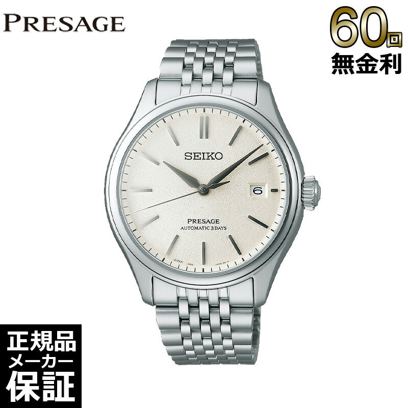 「入荷次第出荷」表記の商品のうち、仕入先にて在庫切れとなっていた場合、 一部商品を除き約1ヶ月以上お時間を頂く場合がございます。予めご了承ください。 お急ぎのお客様は、在庫状況を確認させて頂きますので、ご購入前にお問い合わせ下さいます様お願い申しあげます。<セイコー プレザージュ>より日本の工芸品のような用の美をしなやかにまとう新シリーズ、「クラシックシリーズ」が登場≪商品特徴≫華飾を削ぎ落したしなやかなフォルムのケースと着け心地の良さを究めたクラシックなブレスレットデュアルカーブガラスを採用し、柔らかな曲面で構成されたケースデザインは、中心に向かって緩やかに丸みを帯びたダイヤルと呼応し、つい触れたくなるような柔和な雰囲気を醸し出します。そして、1970年代に多く見られた腕時計のブレスレットから着想を得て、優美な多列ブレスレットを新たに開発。両面に丸みを帯びた細かいこまを採用することで、手首に柔軟になじむとともに、肌に接する面積を減らし、快適な着け心地を提供します。古来より日本の人々にまとわれてきた「絹」のような質感のカーブダイヤル古くから日本では、軽くて丈夫な絹織物が暮らしの中に取り入れられてきました。絹は柔らかな質感や美しい光沢をもち、現代でも着物や、ハンカチ、ネクタイなど、様々な分野に使われています。本作は、丸みを帯びたカーブダイヤルに、日本人の暮らしを彩ってきた絹のような質感の繊細な型打ち模様を施しました。デイト表示付きの3針モデルのダイヤルは、高級感のある柔らかな絹織物の織目をイメージしてします。さらに、インデックスの上面や、秒針と分針の先端も、ダイヤルの球面に合わせて緩やかに曲げました。