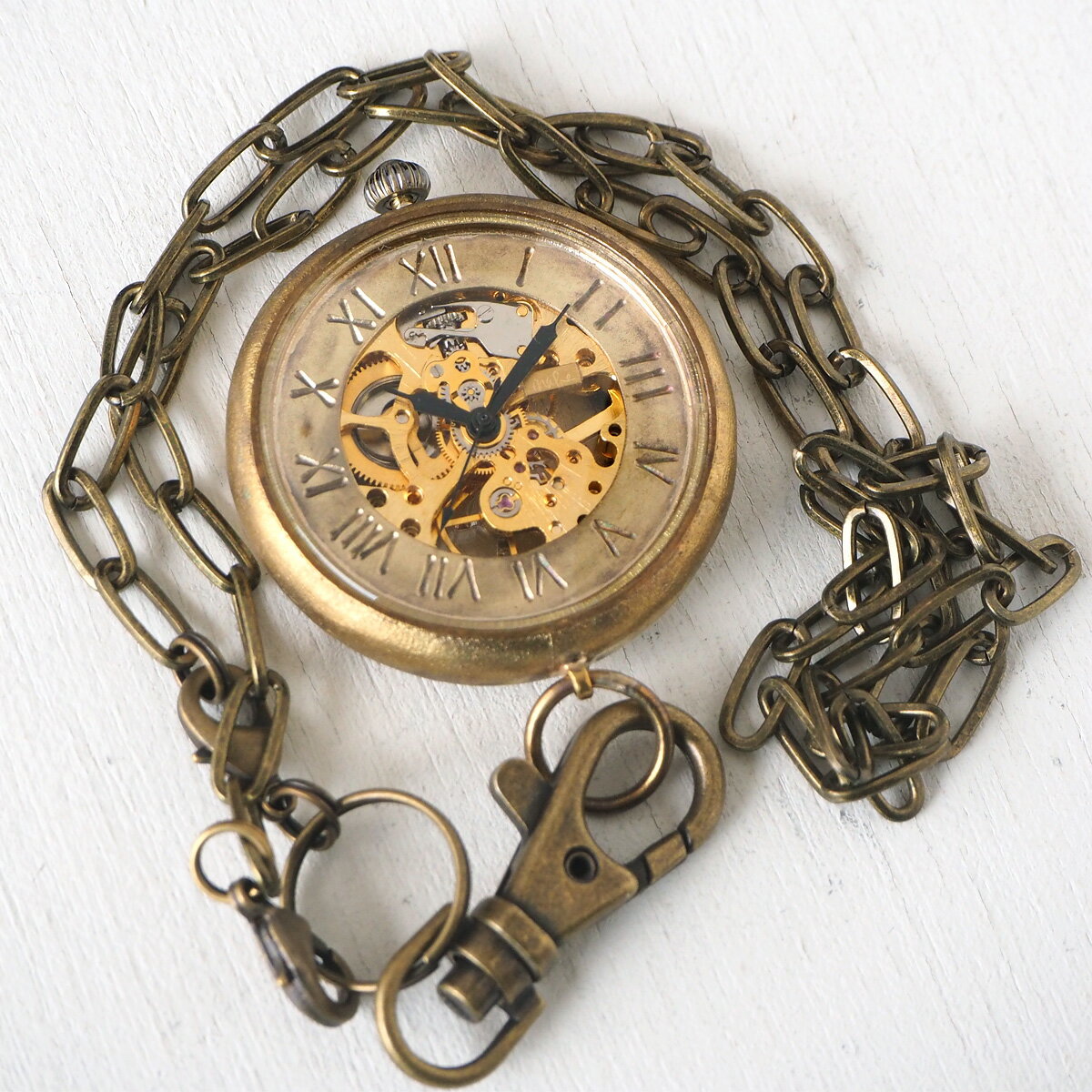 渡辺工房 手作り懐中時計 手巻き裏スケルトン ジャンボブラス 甲丸ケース 真鍮チェーン [NW-BHW110] 時計作家 渡辺正明 ハンドメイドウォッチ メンズ レディース レトロ アナログ ローマ数字 真鍮 ビッグフェイス 蓋なし 刻印・名入れ無料 日本製 国産