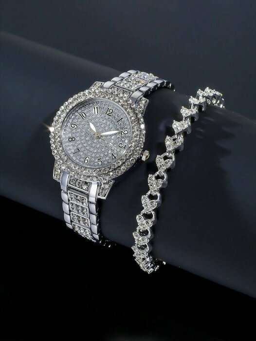 [ 8日から12日程度でお届け予定 ] 腕時計 レディース セット 女性ファッション用 ローマ数字バングル腕時計 全身宝石 ダブルレイヤー ブレスレットセットウォッチ コンボ シルバートーン