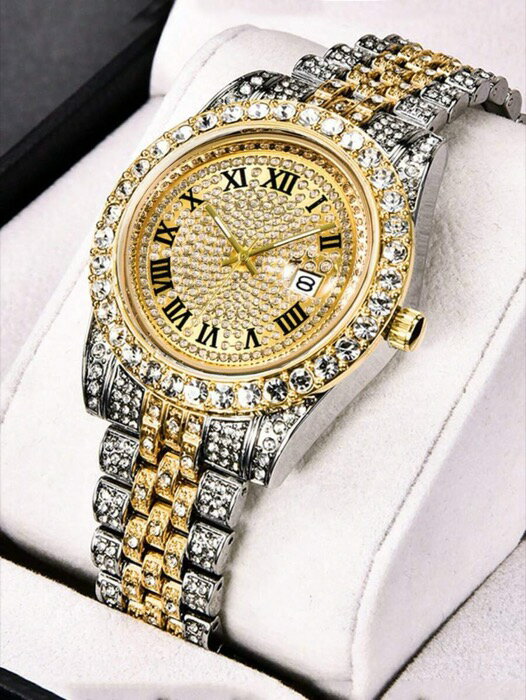 [ 8日から12日程度でお届け予定 ] 腕時計 メンズ クォーツ 1個 メンズファッションビジネス ローマ数字ダイヤル フルダイヤモンド クォーツ スチールバンド 腕時計、デイリーコーディネートに適し、誕生日、男性へのギフト、記念日、年末、独身の日、ハロ