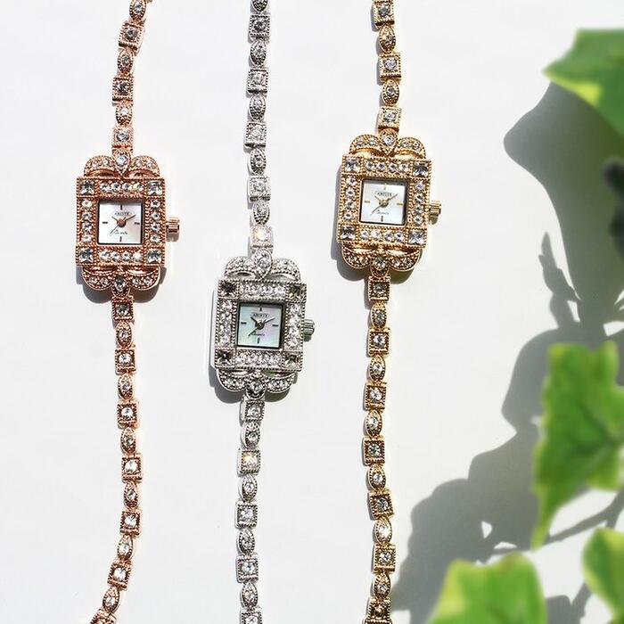 スッキリとしたスクエアフェイスが大人っぽい、スワロフスキーエレメンツを贅沢にあしらったアンティーク調のドレスウォッチ。細いチェーンベルト部分にも一粒ずつ丁寧にスワロフスキーエレメンツを埋め込み、華奢で可憐な女性を演出。結婚式などのパーティーシーンにもピッタリのデザインです。 ●電池交換式 ※こちらの商品は事前に長さの指定をいただけましたら、コマ詰めをしてお送りすることが可能です。 購入時の「お客様通信欄」にご指定の長さをご記入ください。 カラー:シルバー・ゴールド・ピンクゴールド フェイス:約1.0×1.0cm ケース:約1.9×2.8cm ベルト幅:0.4cm ベルト長さ:約19.2cm(1コマ約0.6cm) 素材:スワロフスキーエレメンツ、白蝶貝、真鍮、ステンレススチールバック 生産国:中国【スーパーセール限定30%OFF】ABISTE(アビステ) スクエアフェイスアンティーク調ブレスレット腕時計 9170016