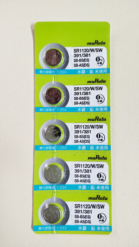 ムラタ酸化銀電池「SR1120 W / SW」 直径11.6mm 厚み2.0mm ムラタ製の腕時計用ボタン電池です。 時計の電池交換にどうぞ。 ※SR1120には「SW」と「W」の2種類がありますが、この電池で共通になりました。 1個単位と5個単位の販売をしており、同一種類を5個単位のほうがお値段がお得になっております。 画像は5個パックのものですが、1個単位の場合ここから切り分けてお送りします。 ここは5個単位の販売ページです。 1個単位は「こちら」からお買い求め下さい。